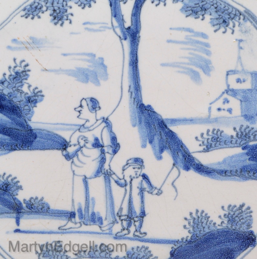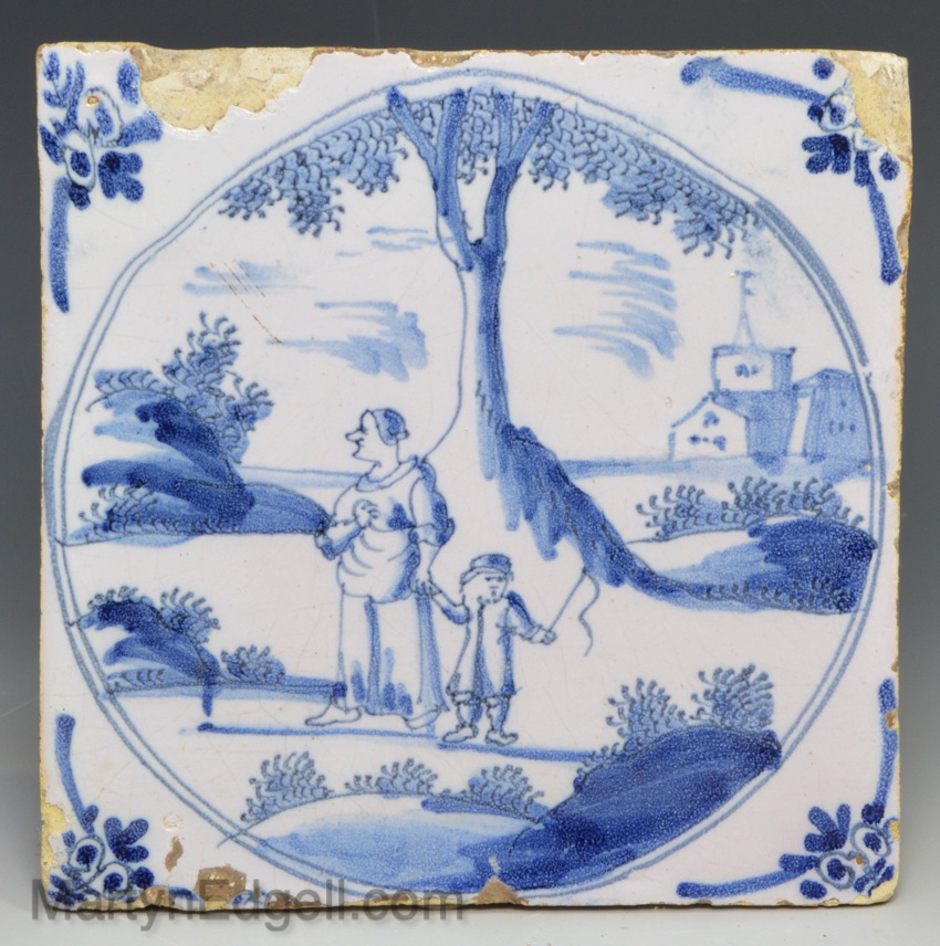 / London delft tile decorated with a woman and her son, circa 1750