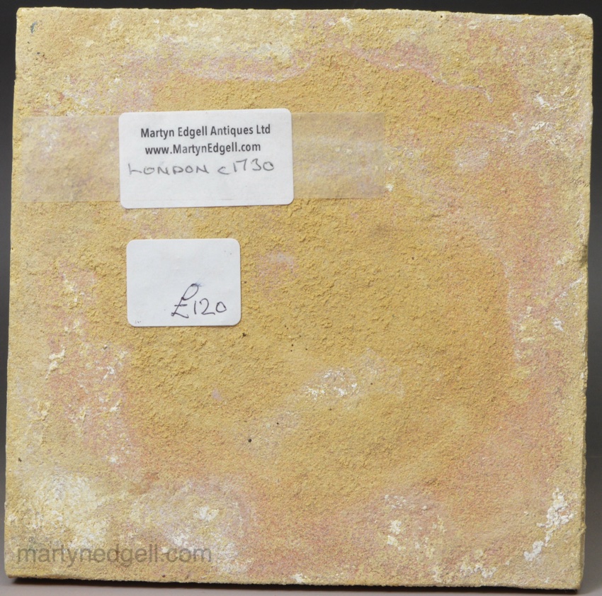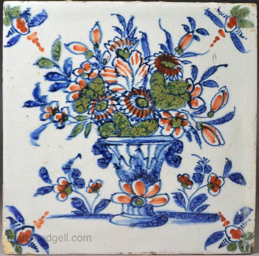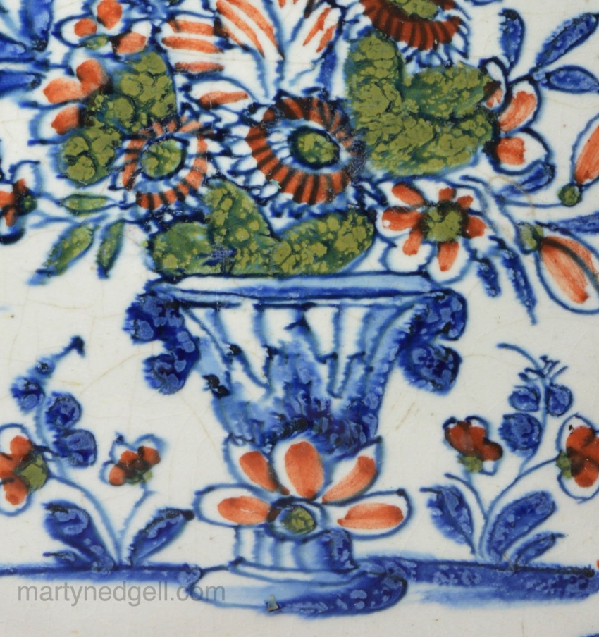 / London delft tile decorated with an urn and flowers in blue, red and green, circa 1740