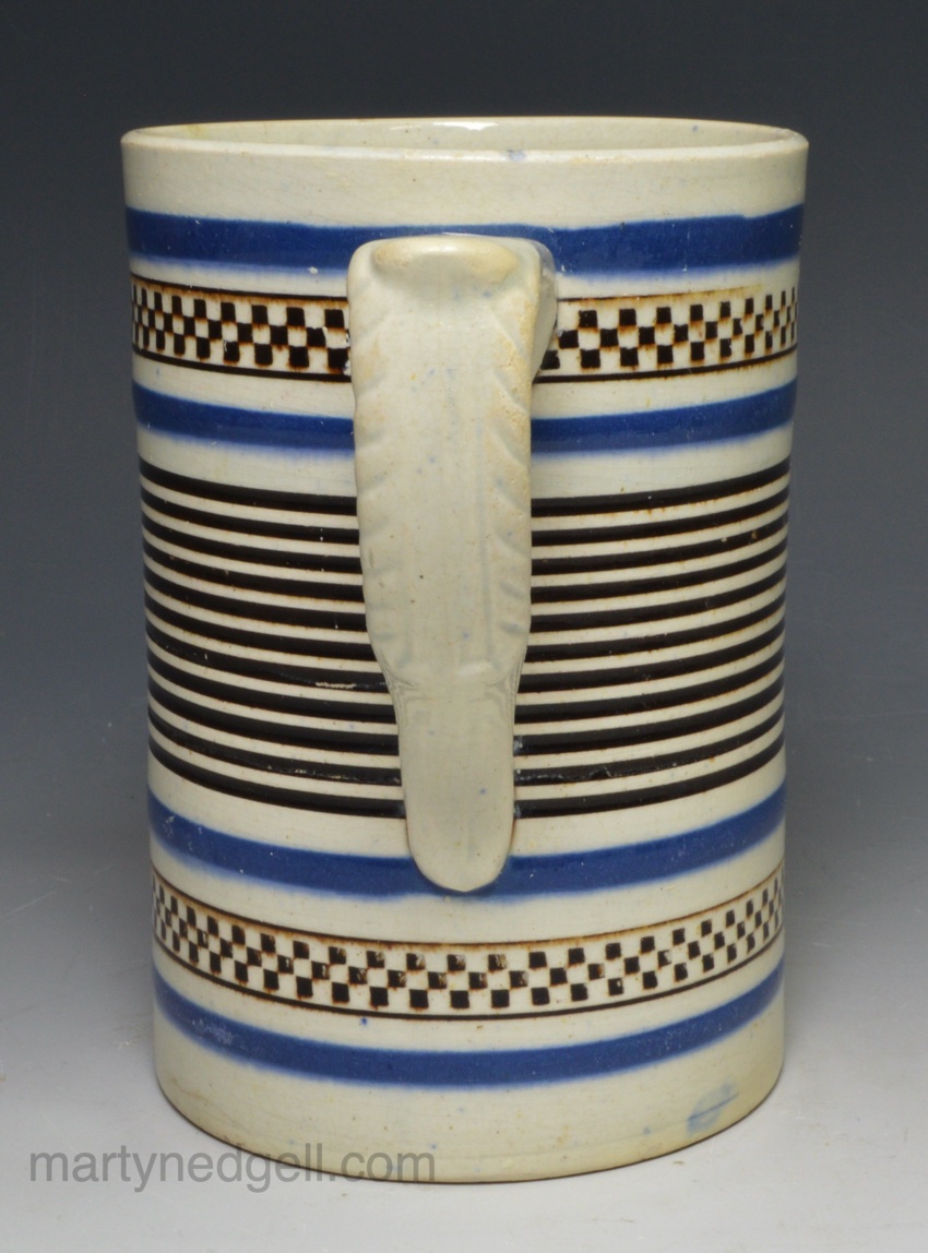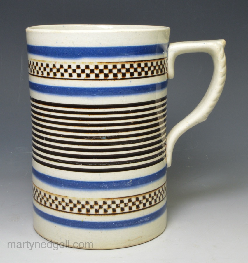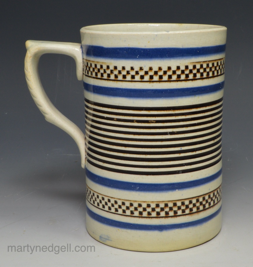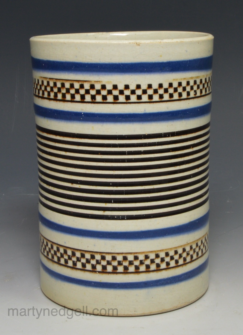 / Mochaware pottery mug decorated with inlaid brown and blue slip, circa 1840