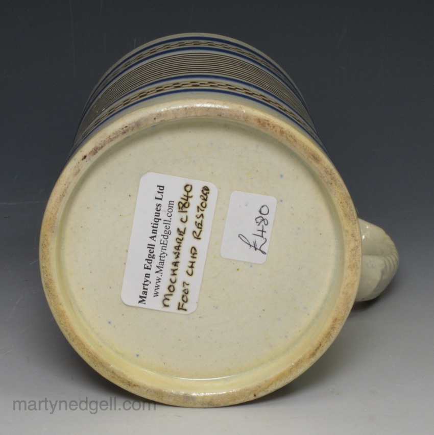 Mochaware pottery mug decorated with inlaid brown and blue slip, circa 1840
