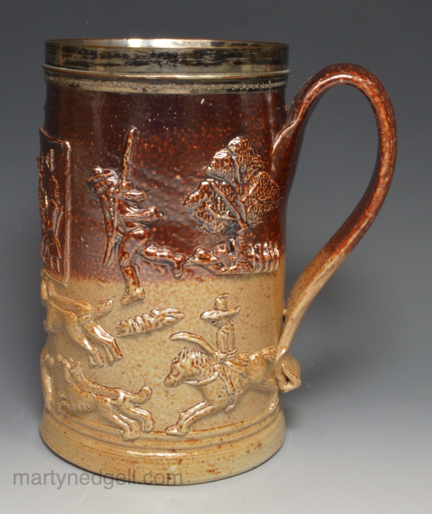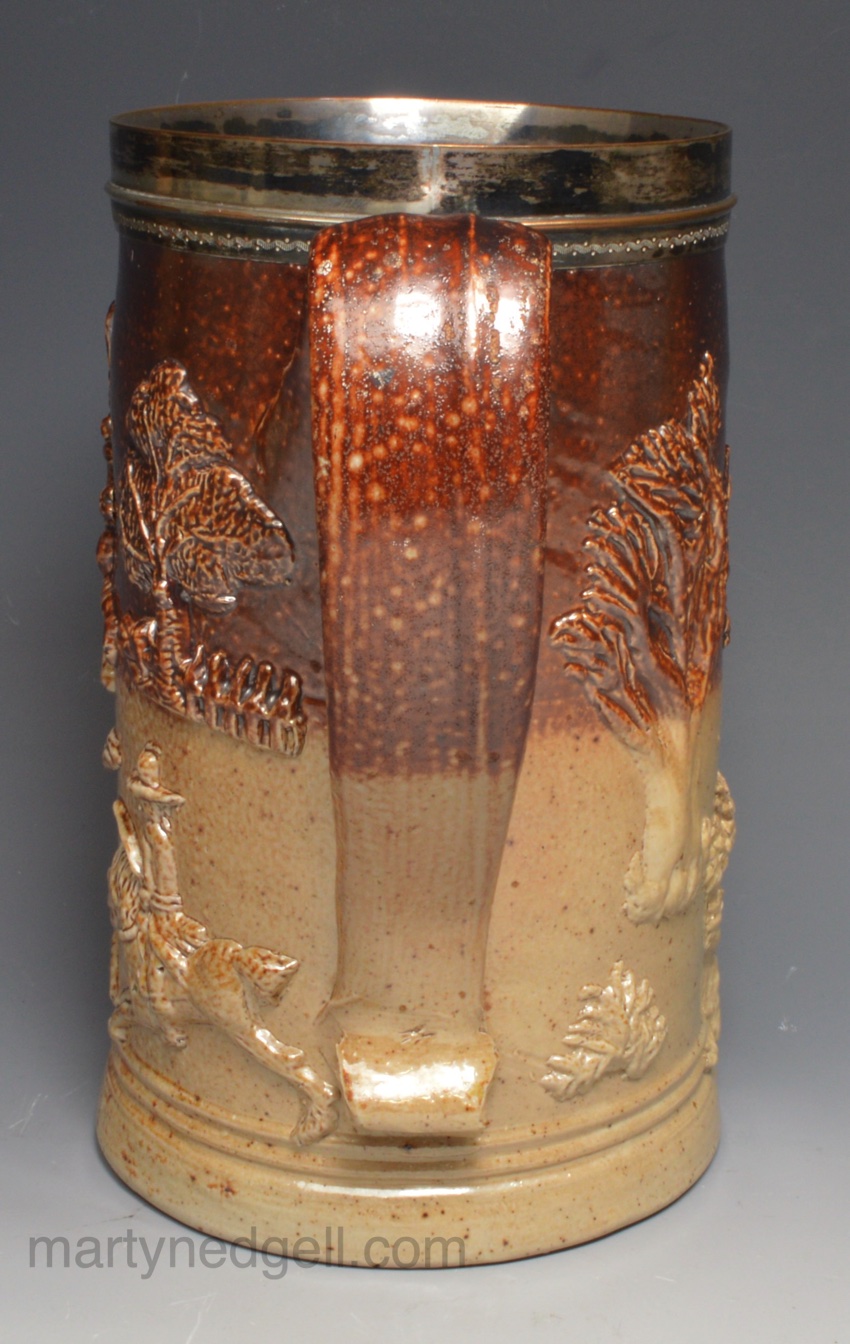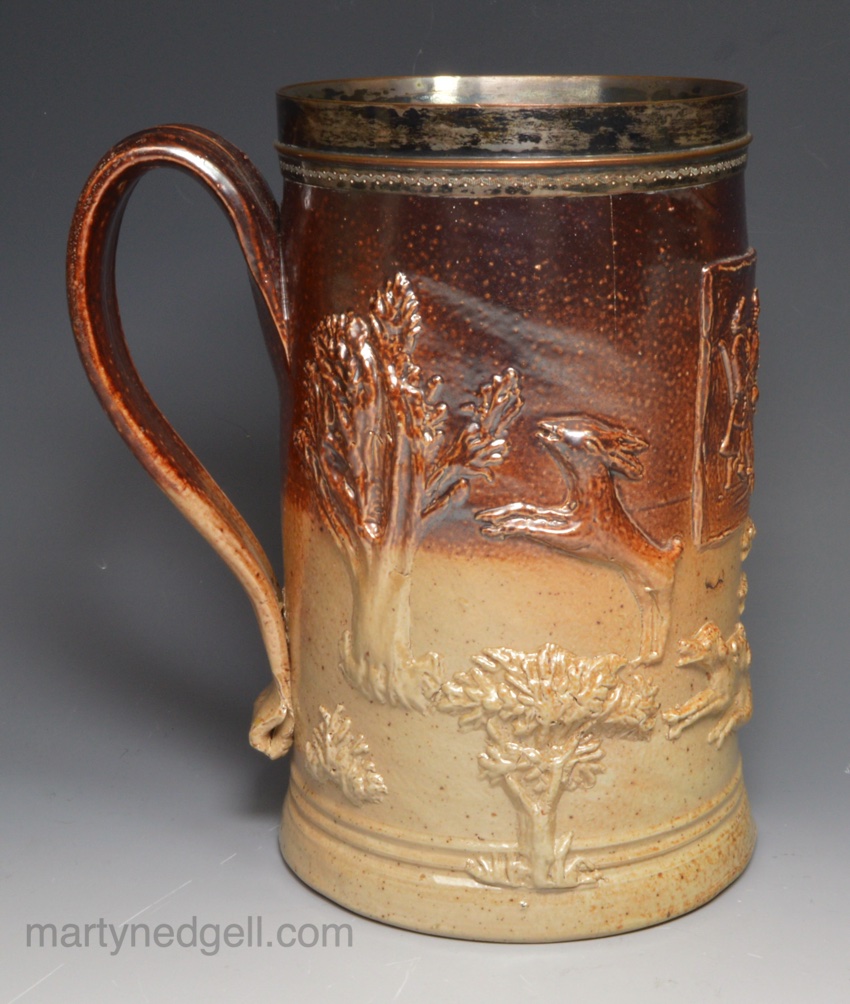 / Mortlake saltglaze stoneware tankard with a panel of Midnight Modern Conversation , circa 1780