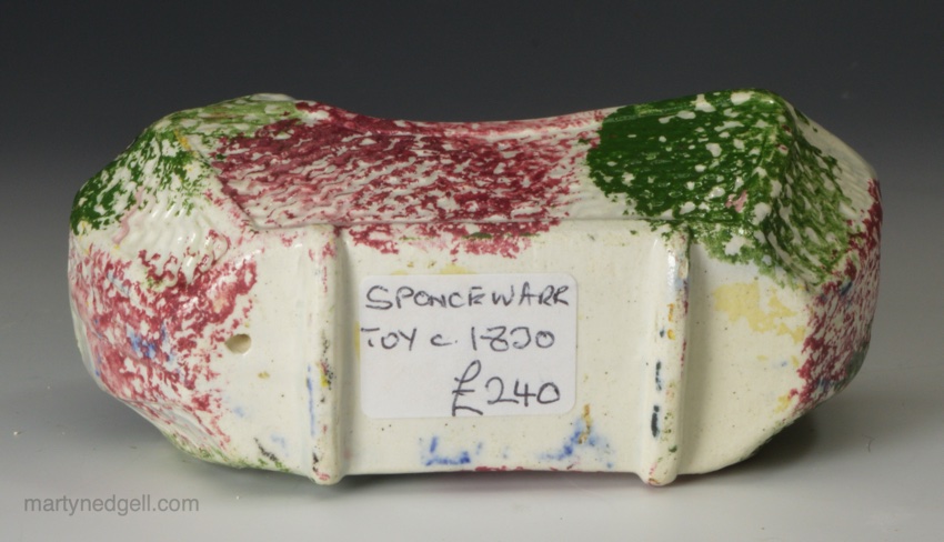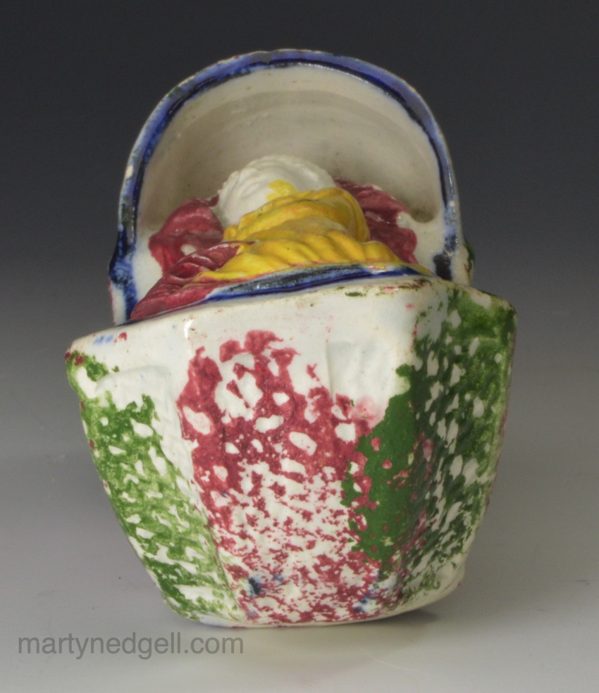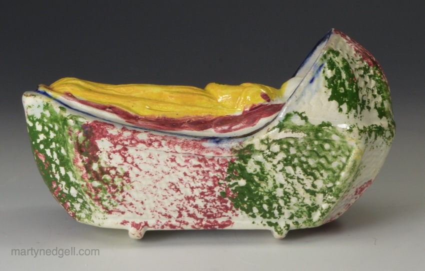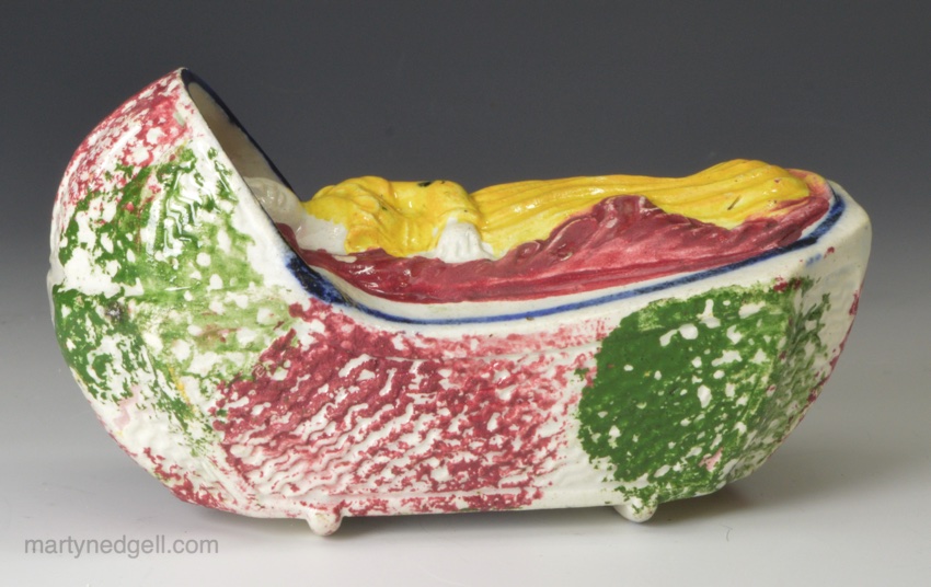 / Pealware pottery toy cradle and child with sponged decoration, circa 1830