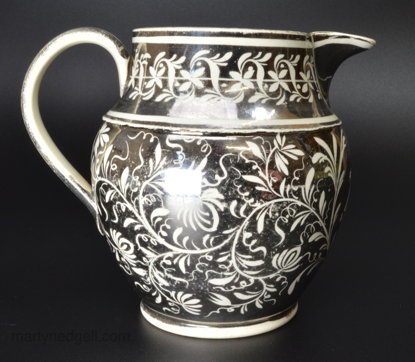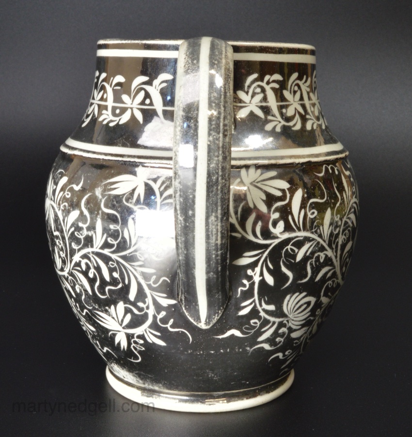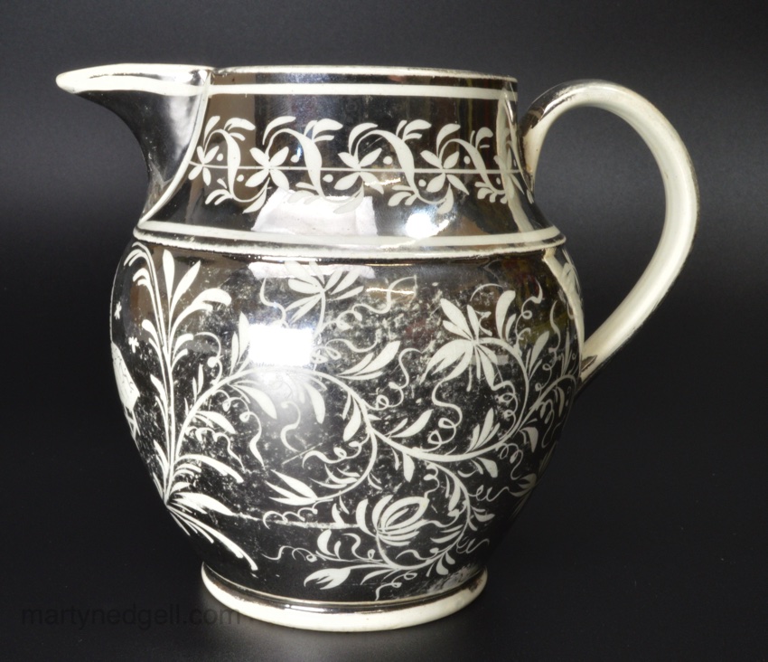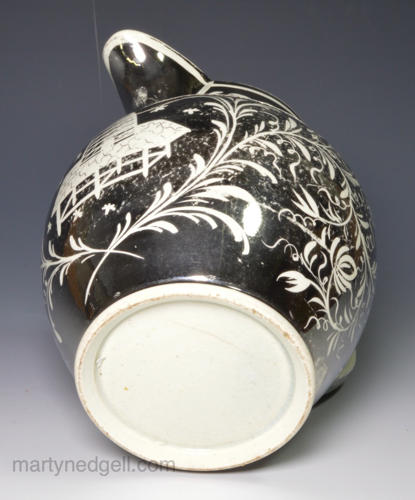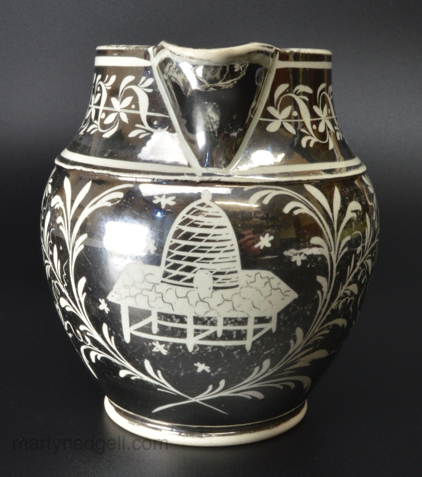 Pearlware jug decorated with bees and beehive in silver resist lustre, circa 1820
