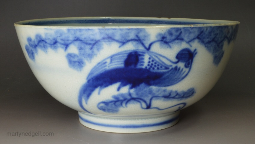 Pearlware pottery bowl painted with a blue bird under the glaze, circa 1820