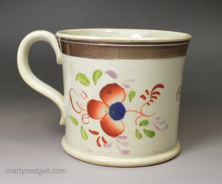 Pearlware pottery child’s mug ‘Thomas’, circa 1840