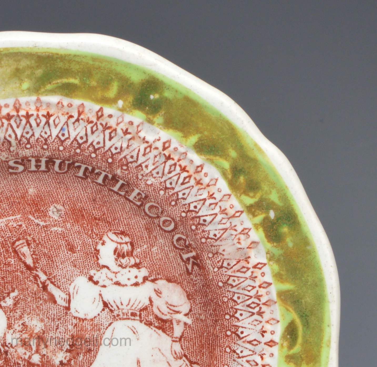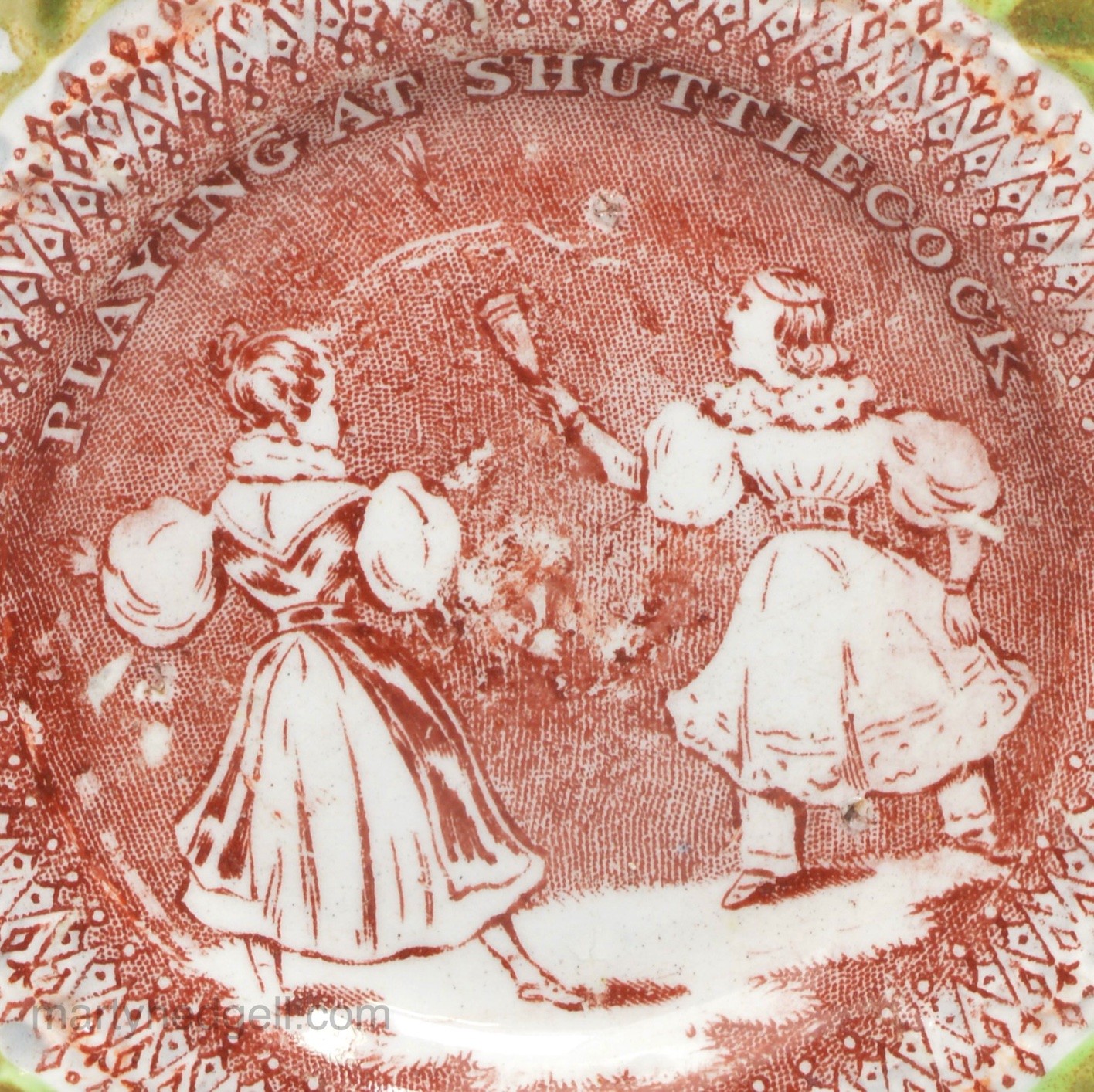 Pearlware pottery child’s plate ‘PLAYING AT SHUTTLECOCK’, circa 1830