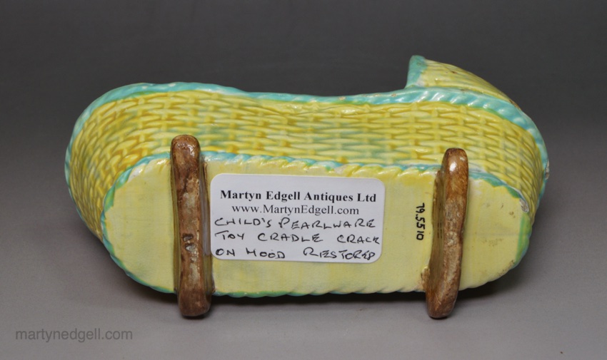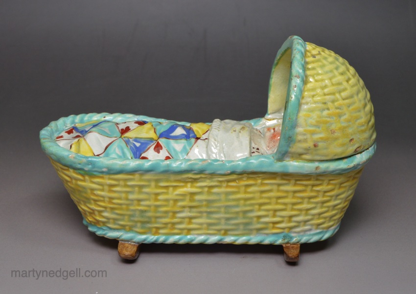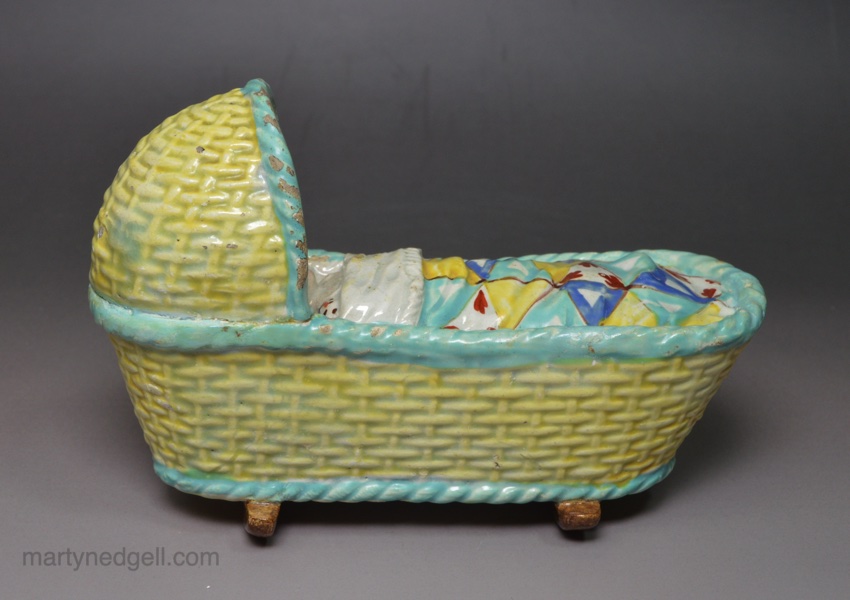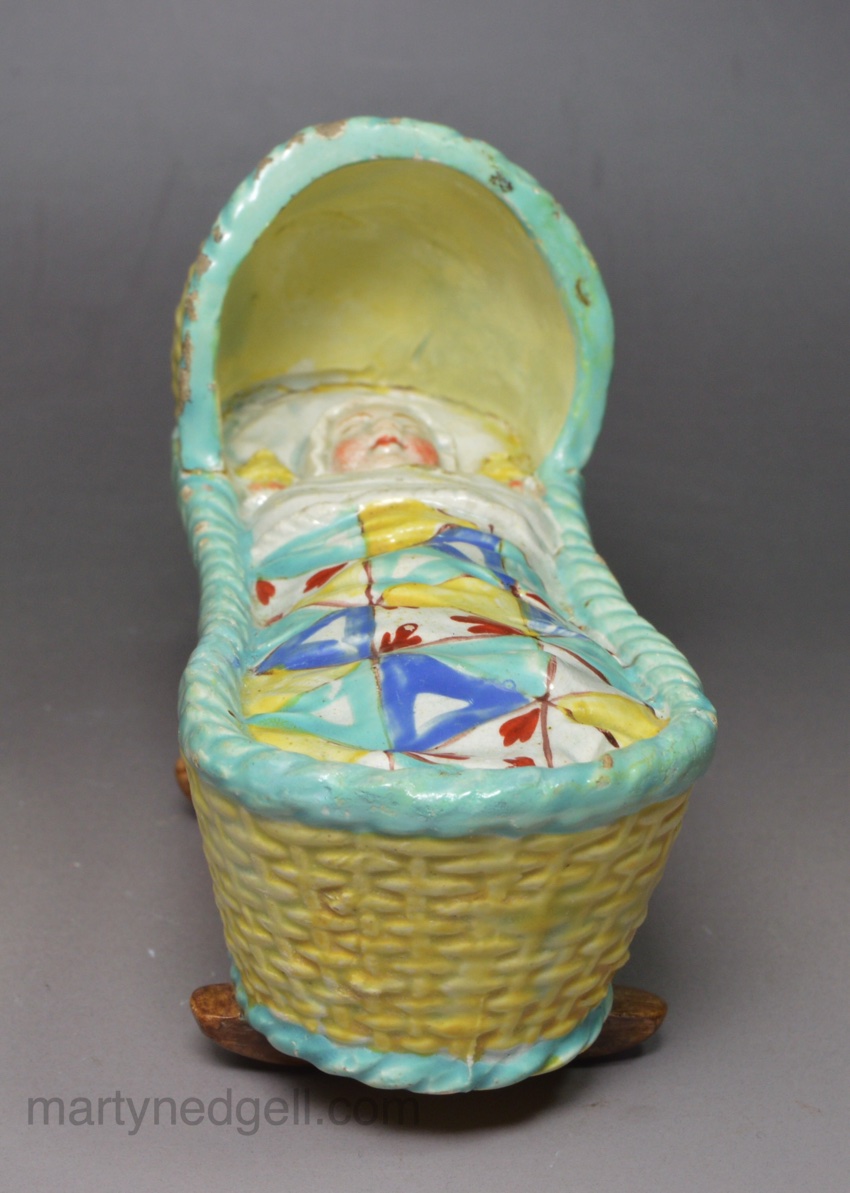 Pearlware pottery child’s toy cradle and baby, circa 1830