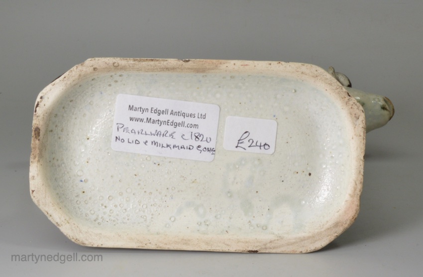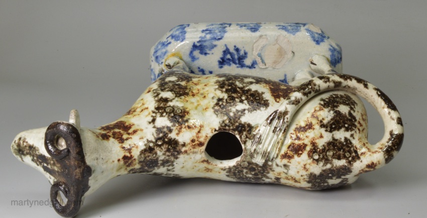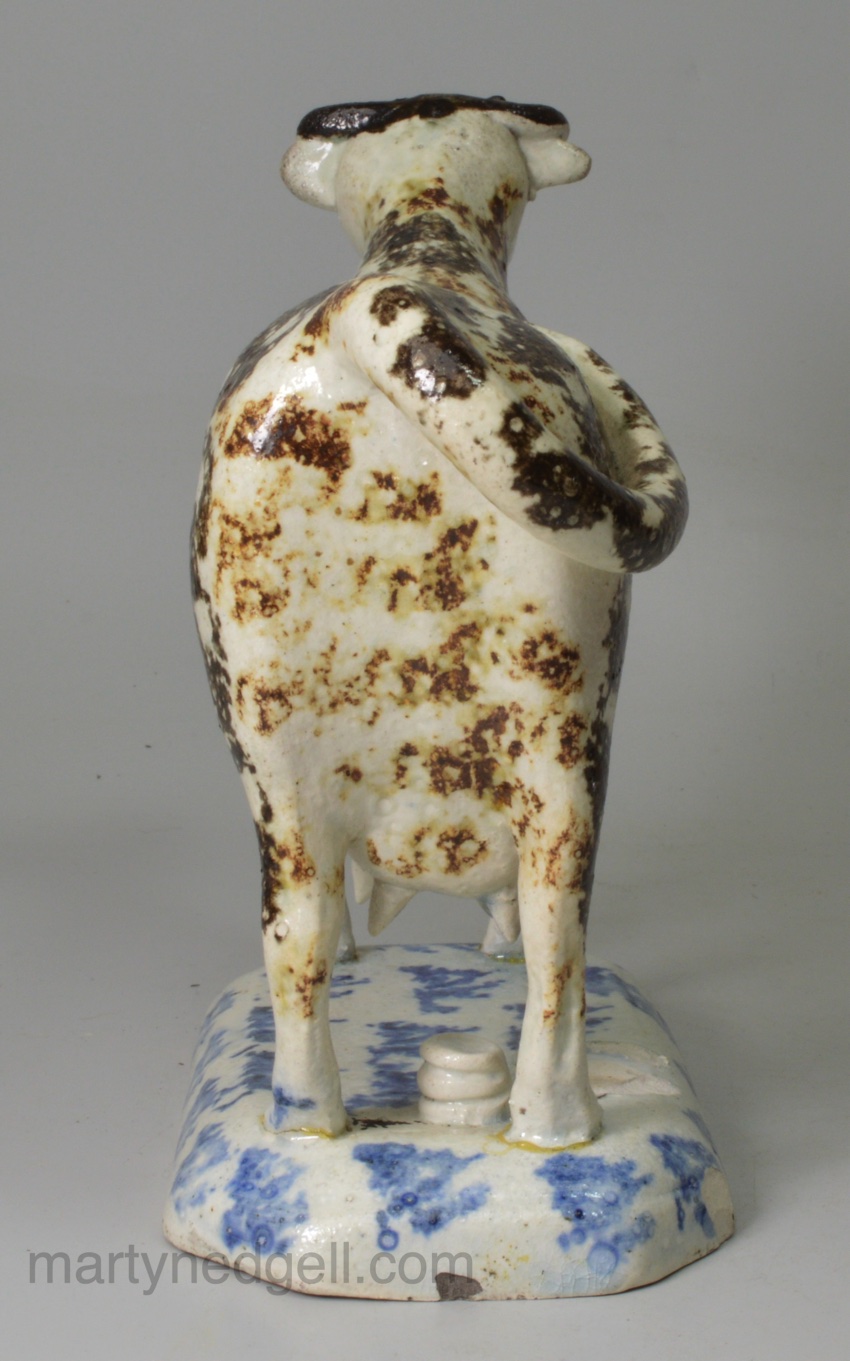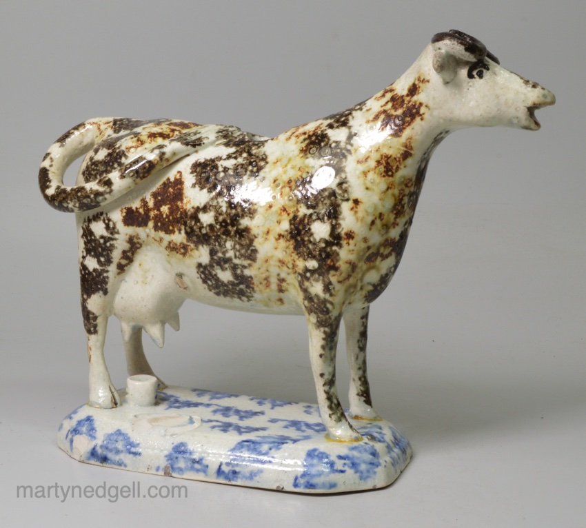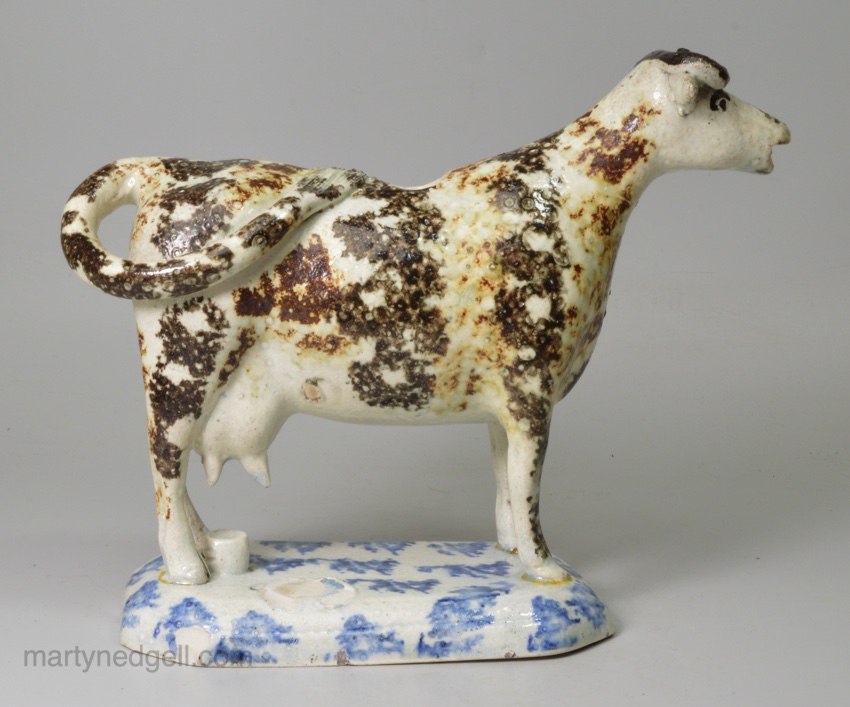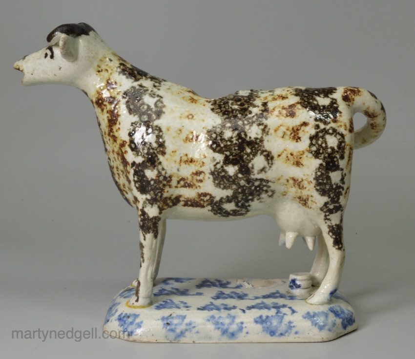 Pearlware pottery cow creamer, decorated with spongeing under the glaze, circa 1820