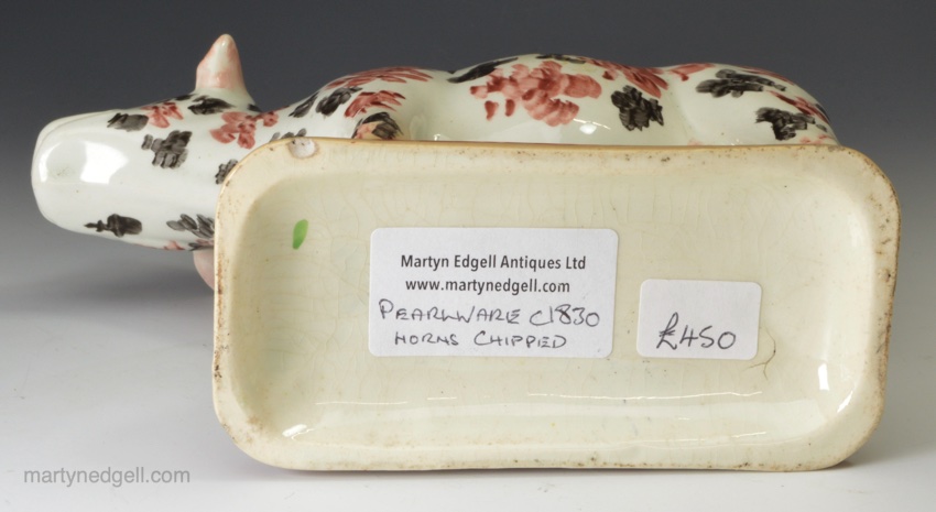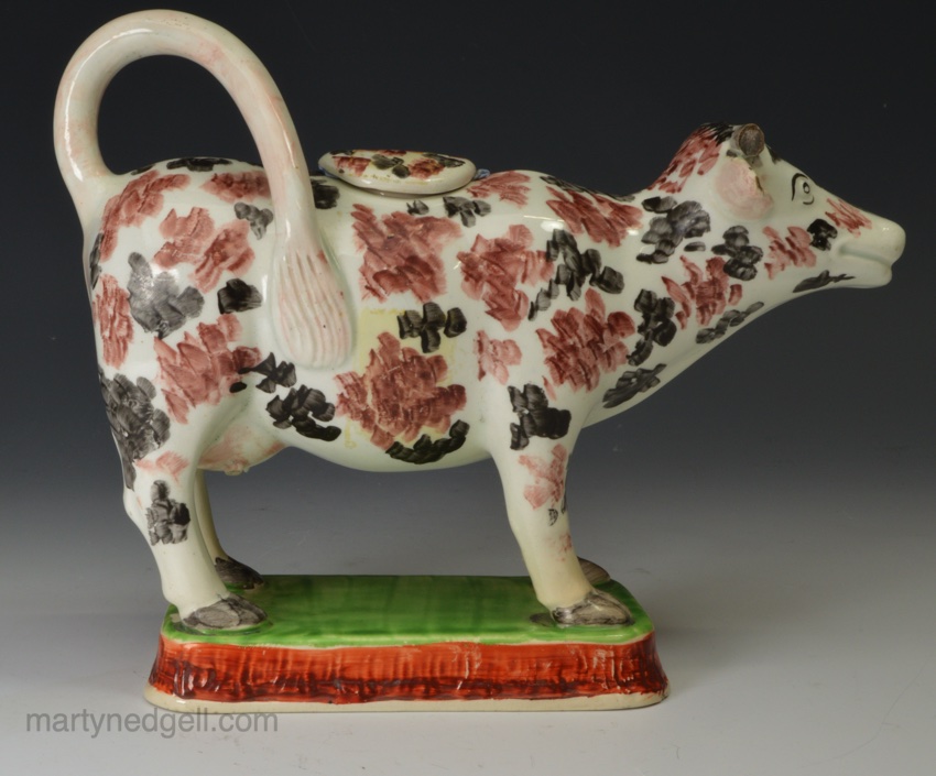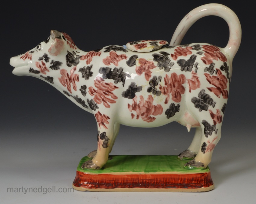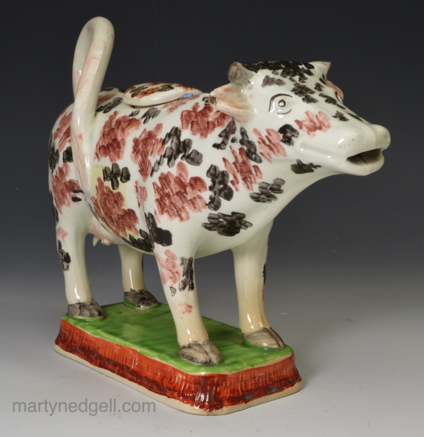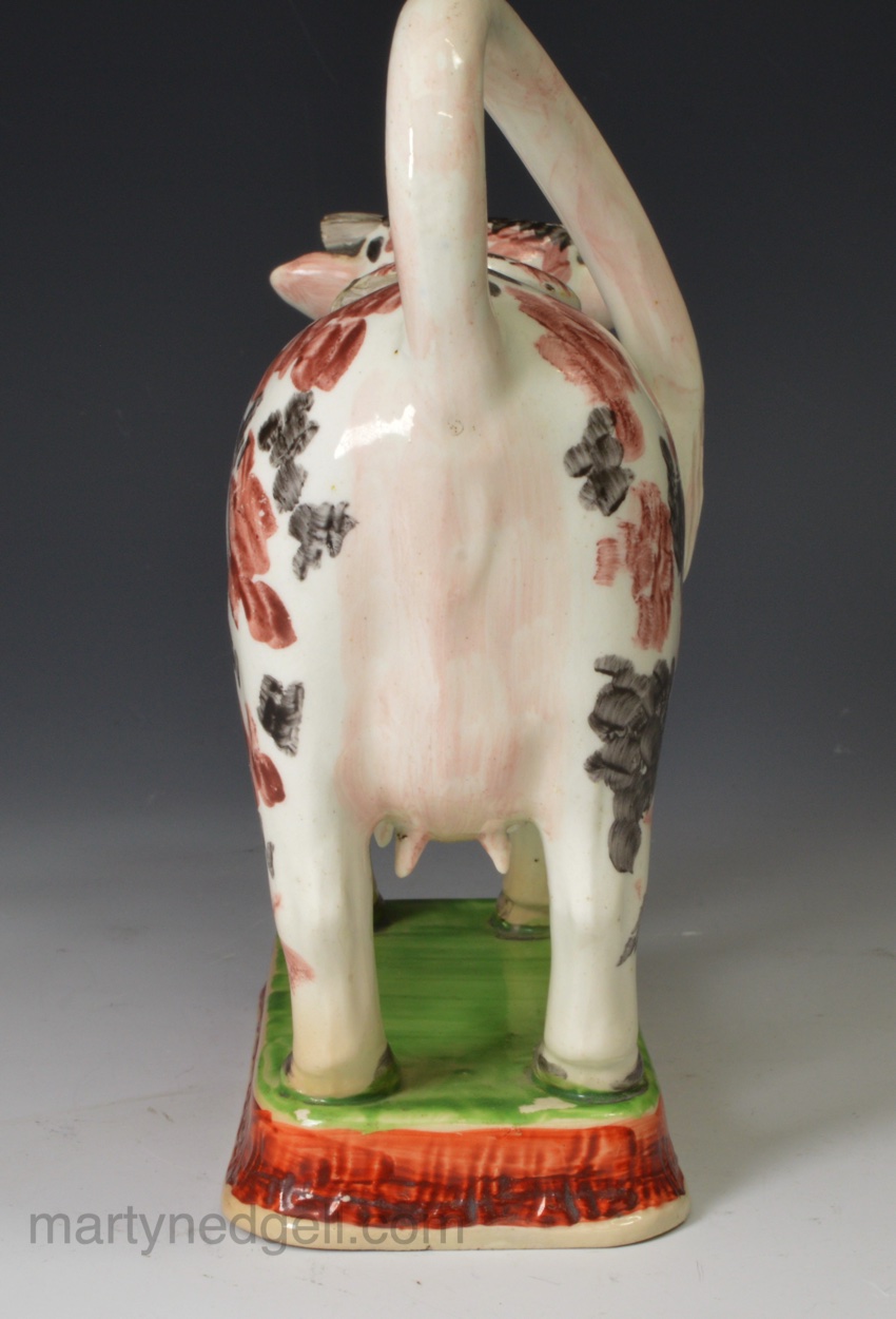/ Pearlware pottery cow creamer decorated with colour over the glaze, circa 1830