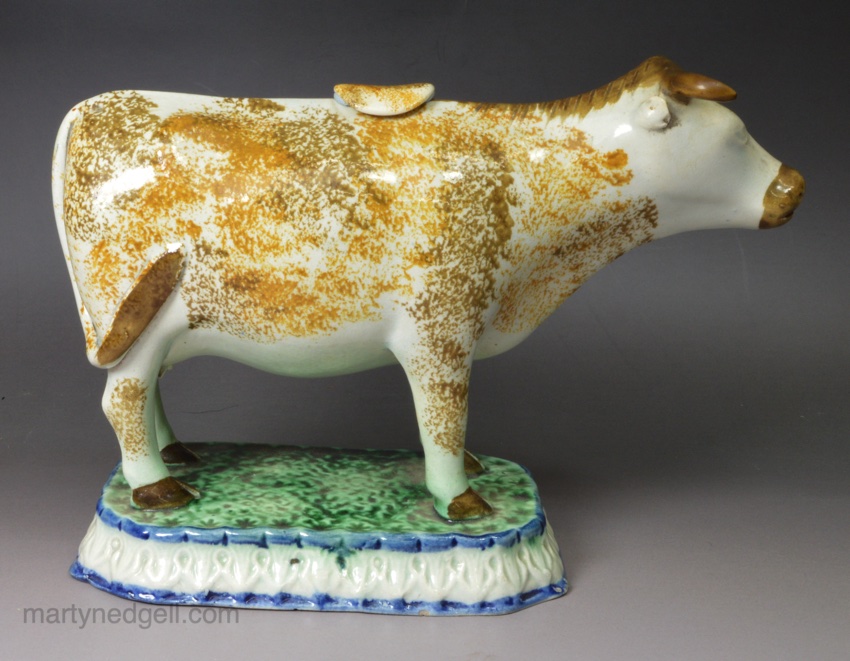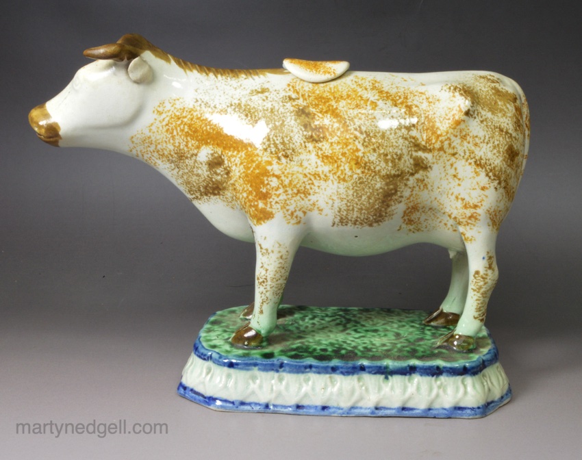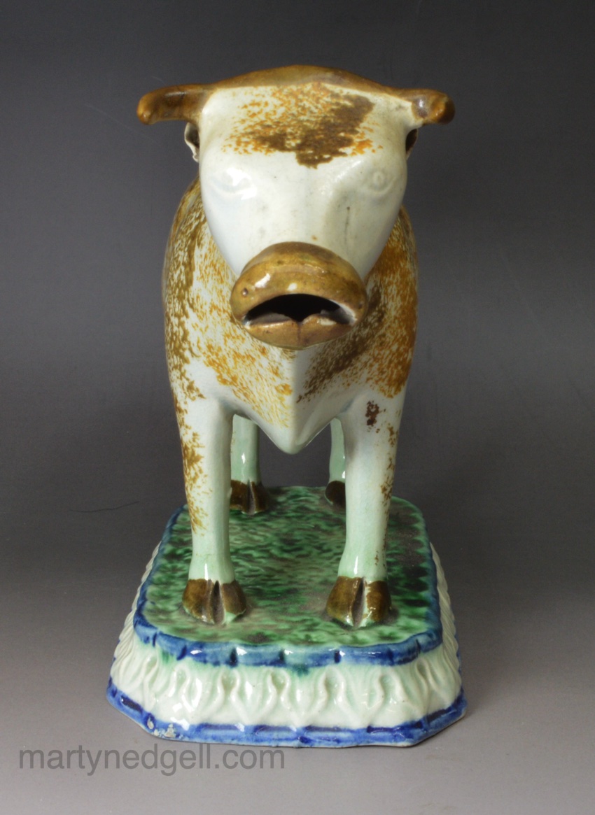 / Pearlware pottery cow creamer decorated with colours under the glaze, circa 1820