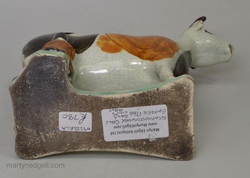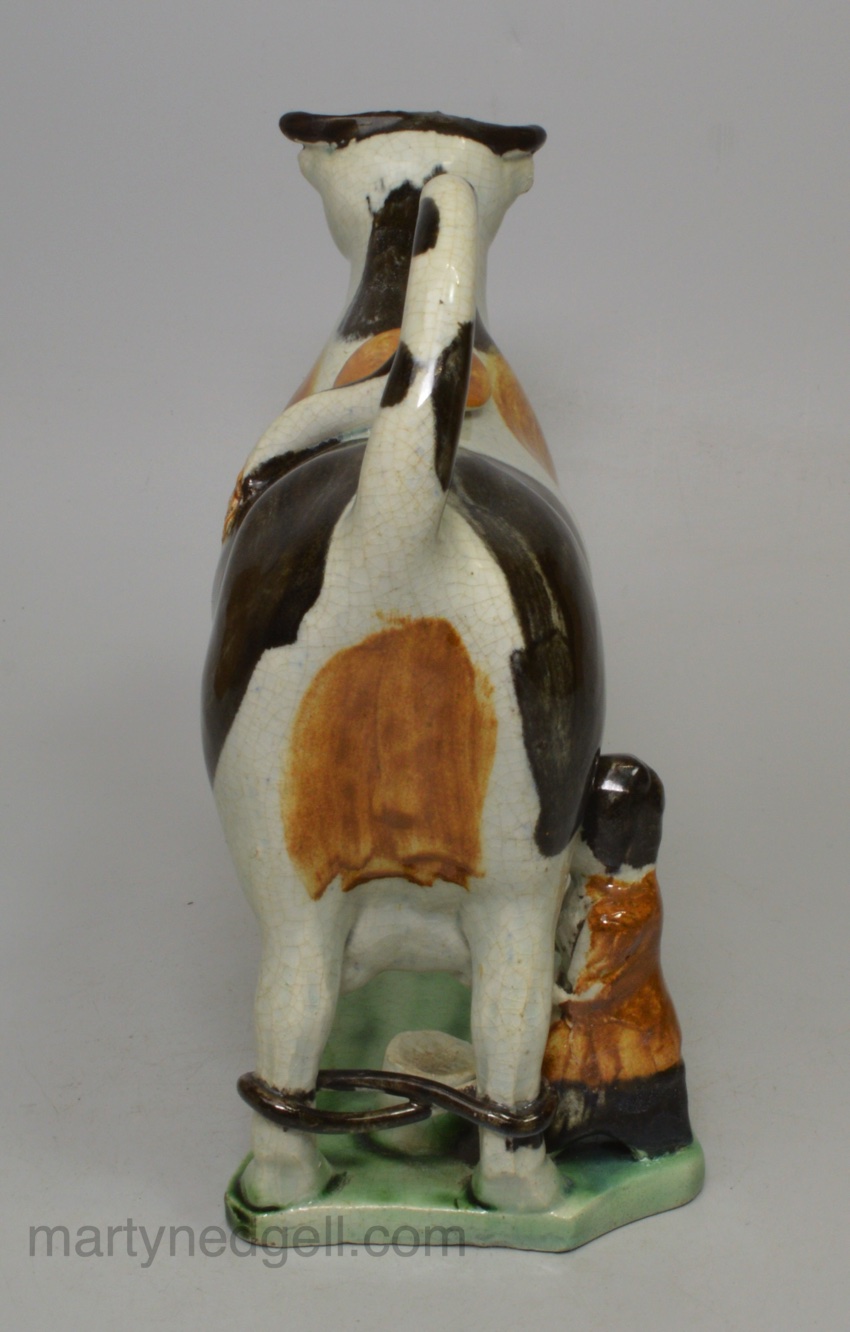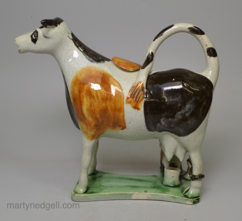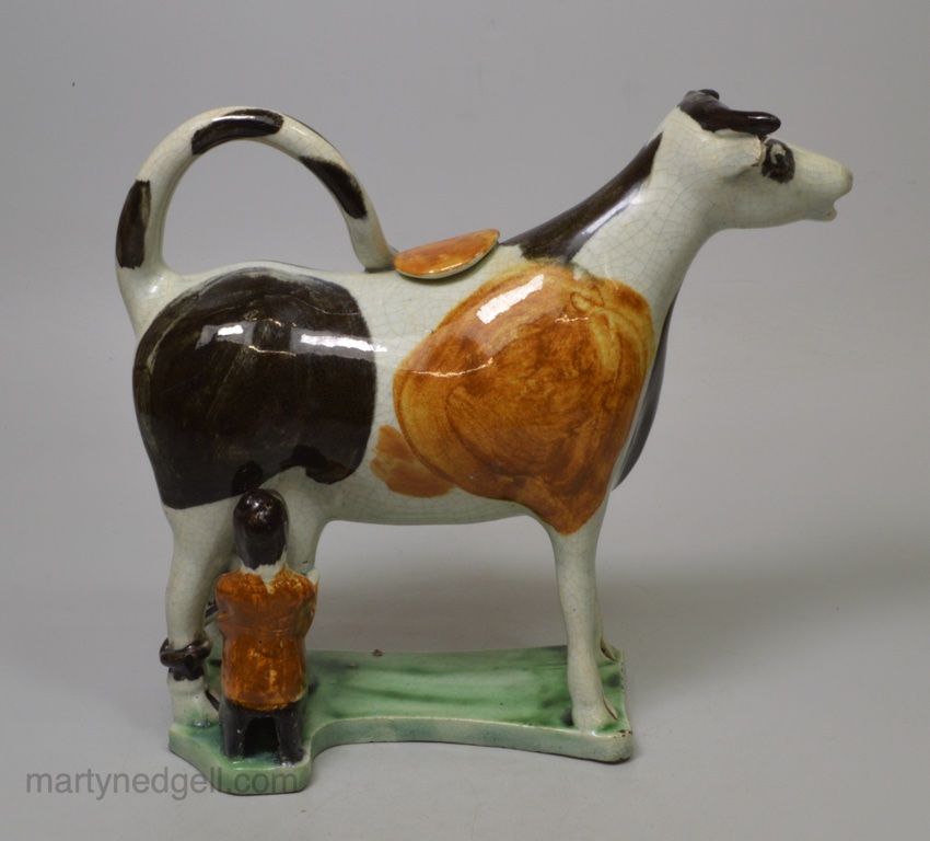 / Pearlware pottery cow creamer decorated with colours under the glaze, circa 1820