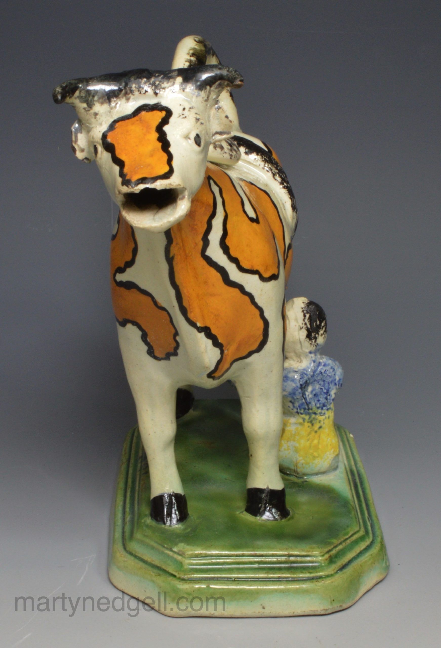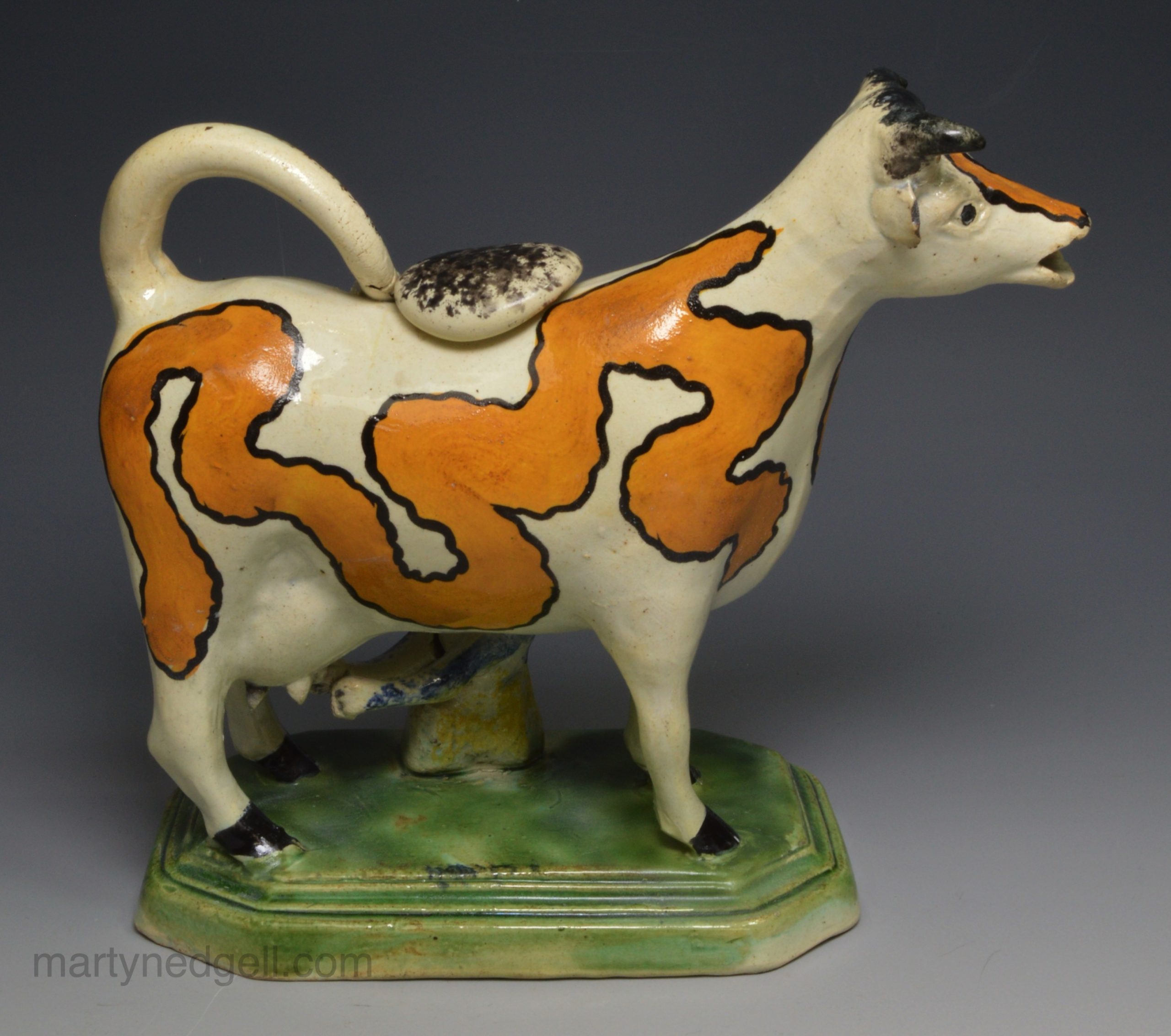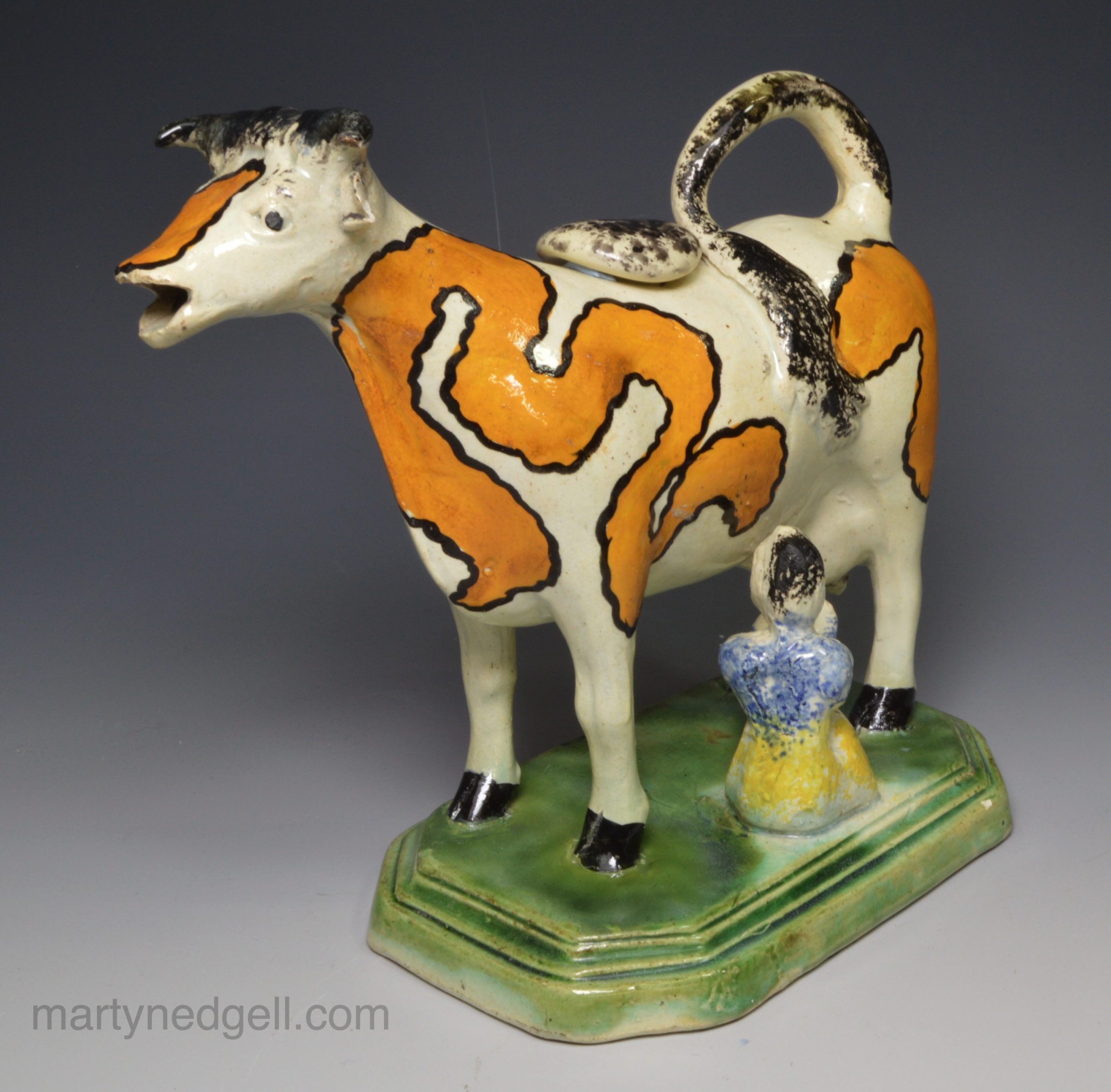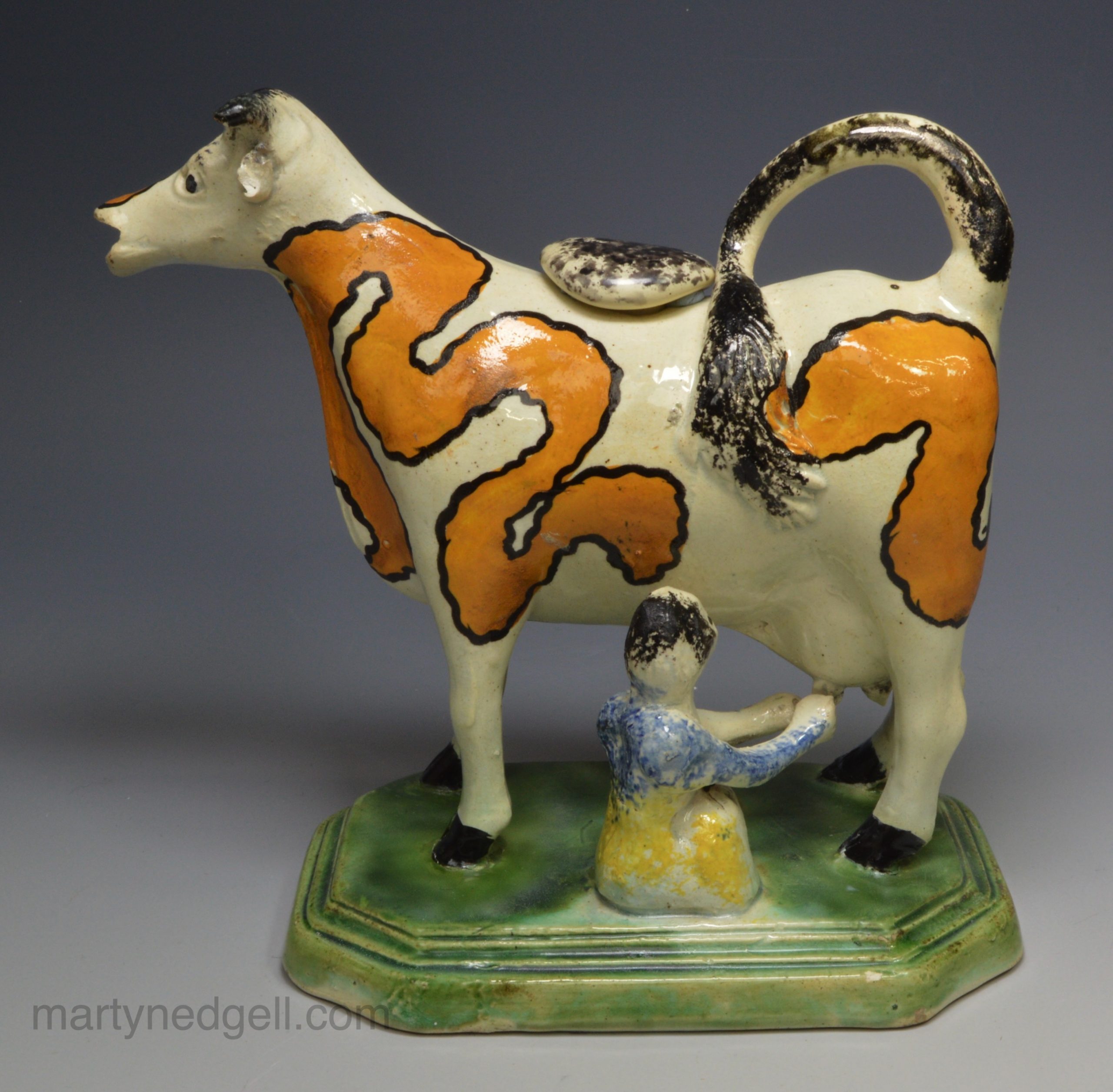 / Pearlware pottery cow creamer decorated with overglaze enamels, circa 1820