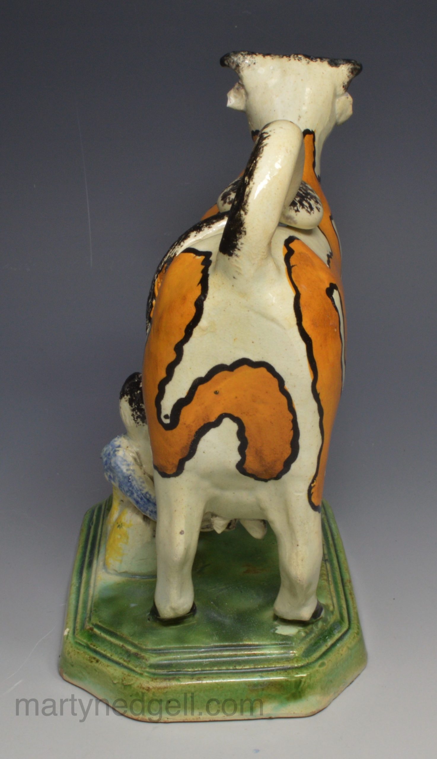 Pearlware pottery cow creamer decorated with overglaze enamels, circa 1820