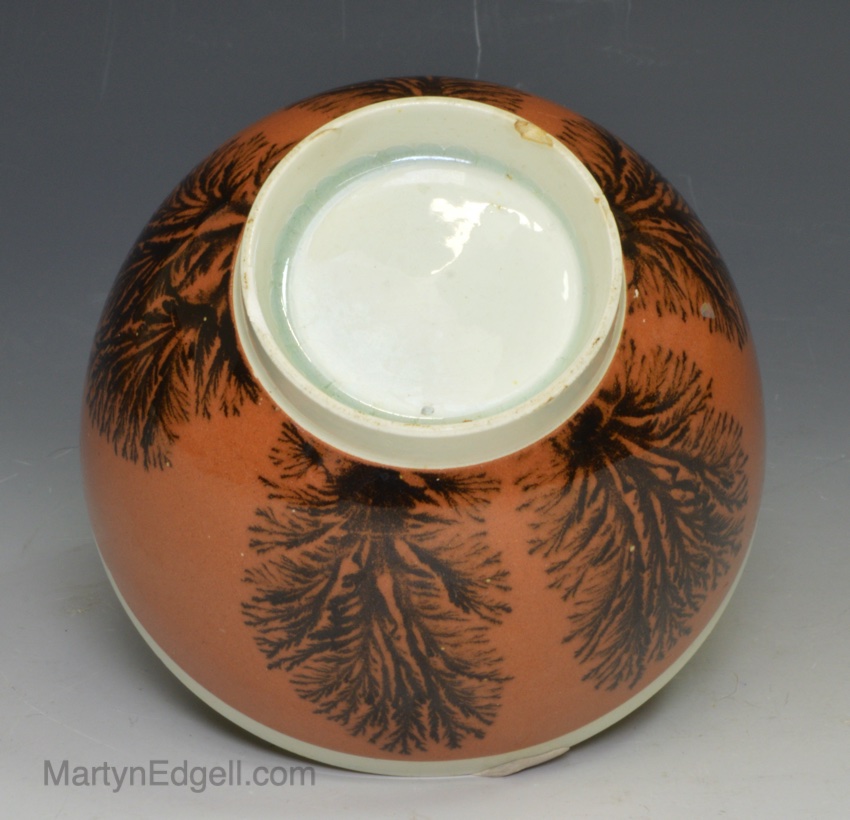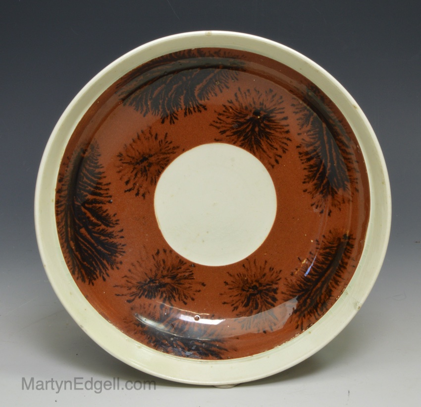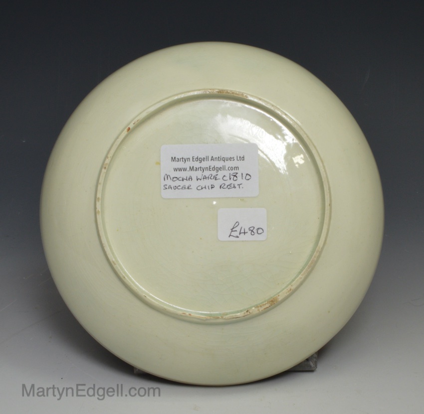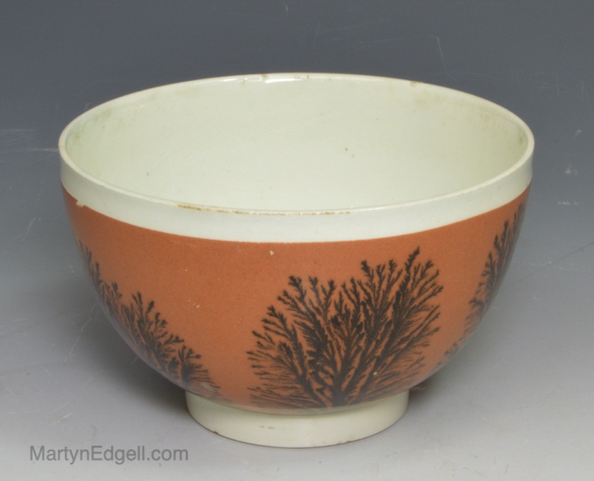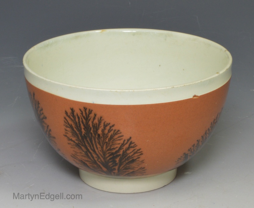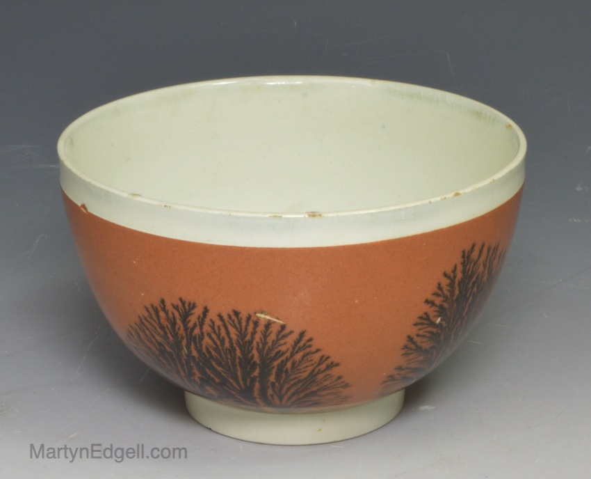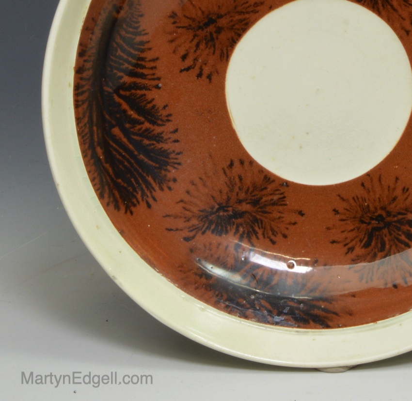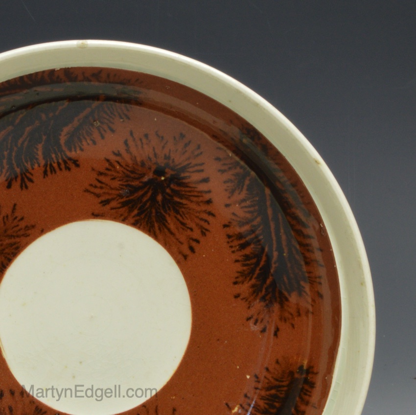 Pearlware pottery cup and saucer decorated with slip and dendritic mochaware markings, circa 1810