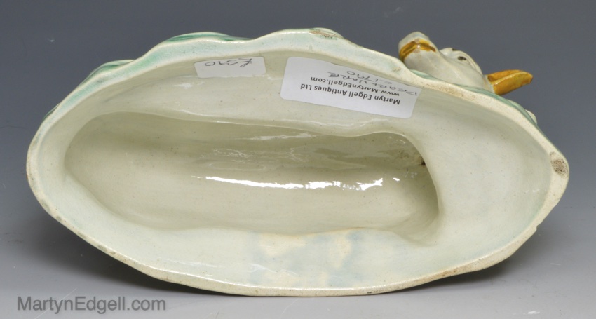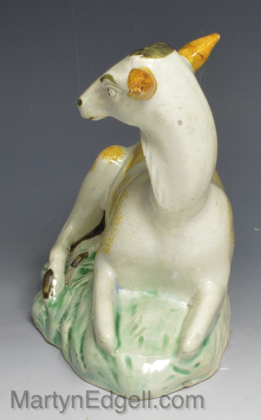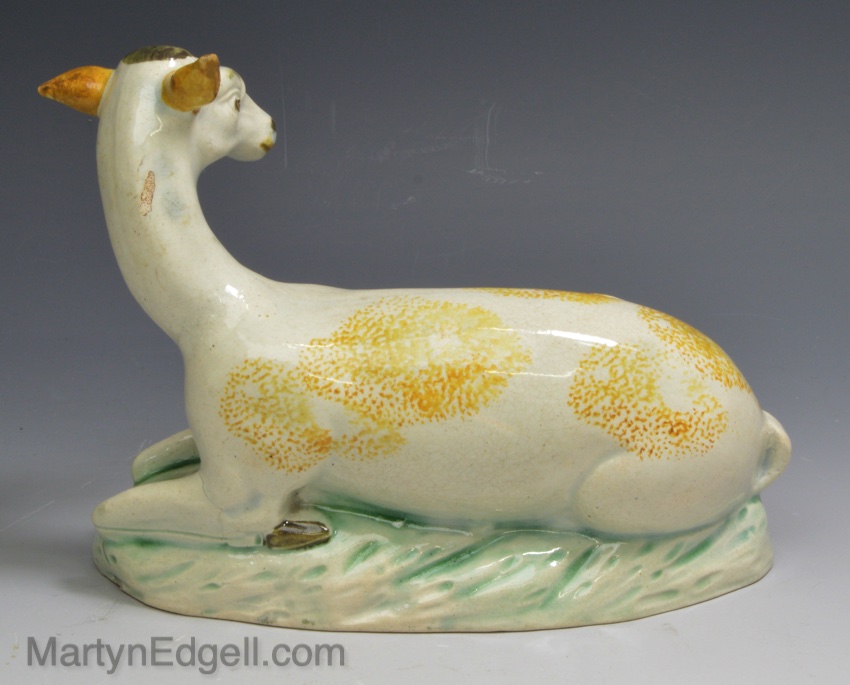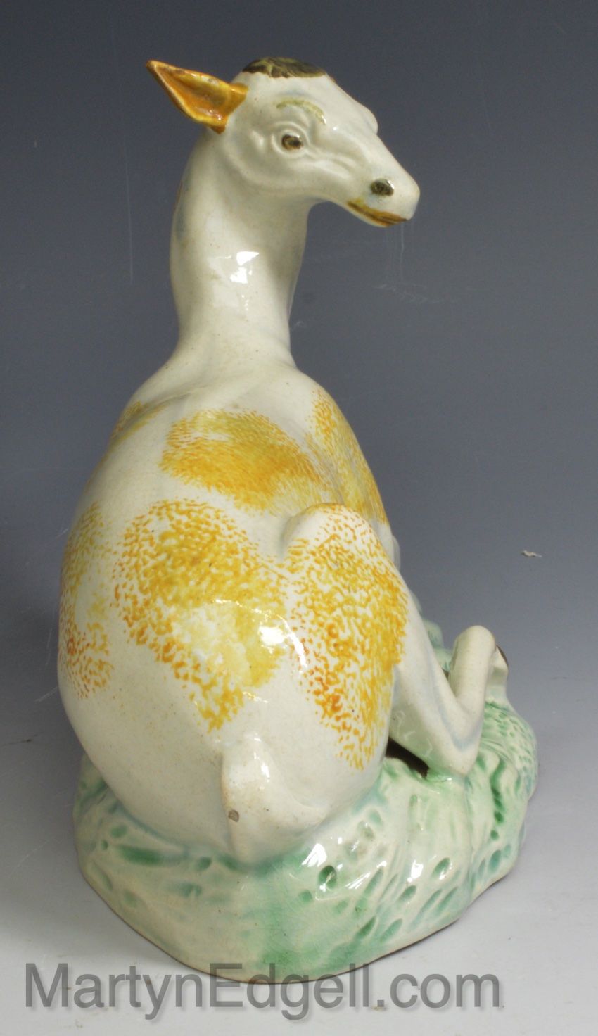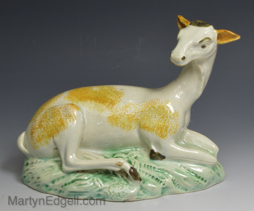 / Pearlware pottery doe decorated with colours under the glaze, circa 1790