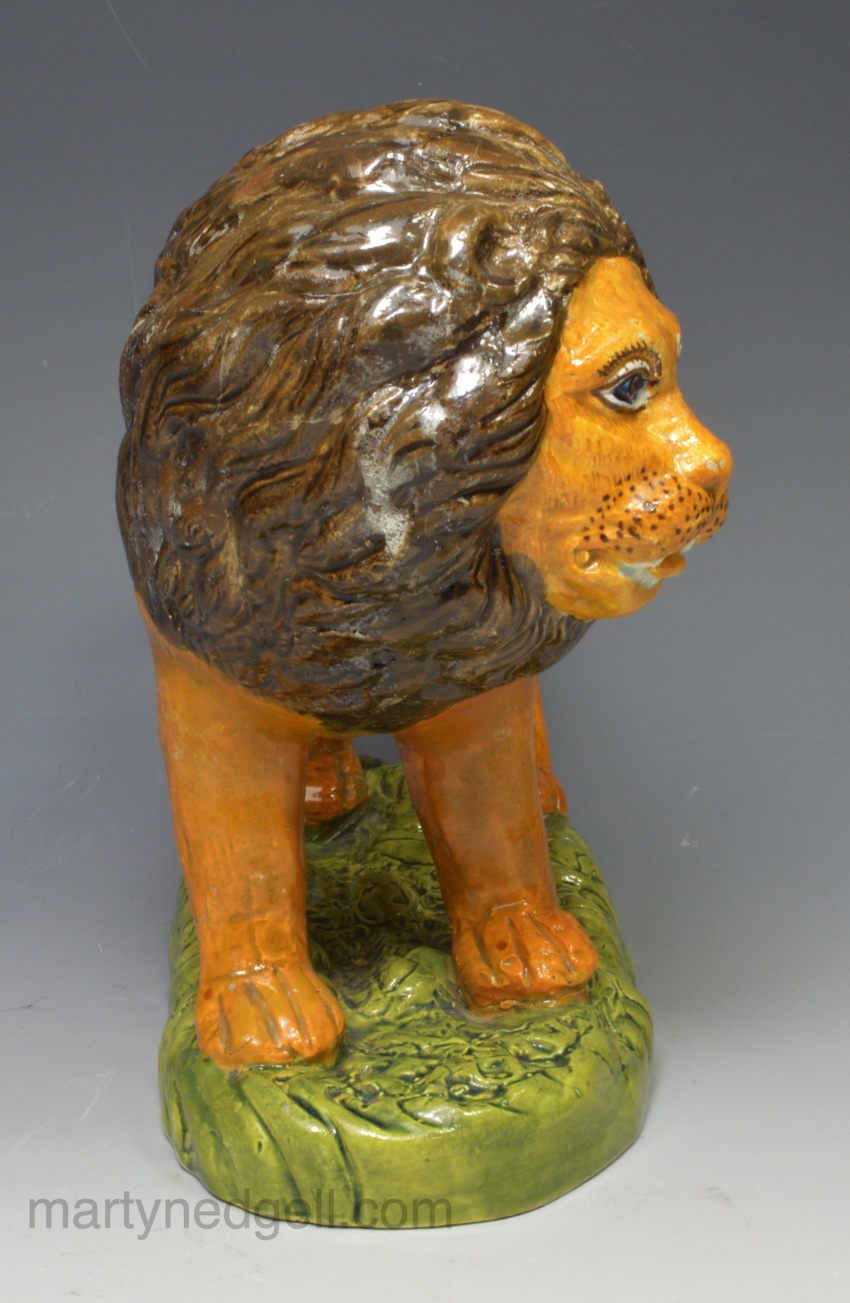Pearlware pottery figure of a lion decorated with colours under the glaze, circa 1810
