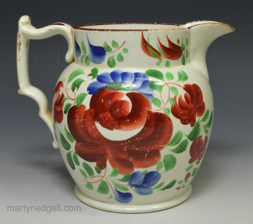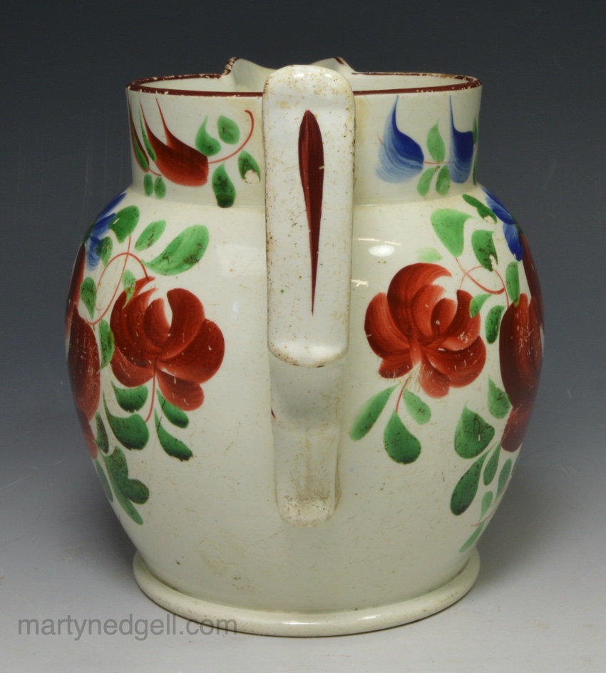 / Pearlware pottery jug painted florals and colours over the glaze, circa 1820