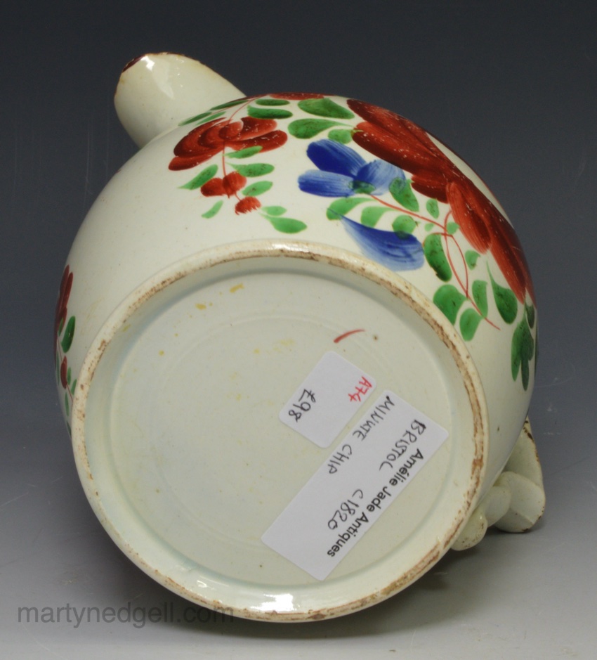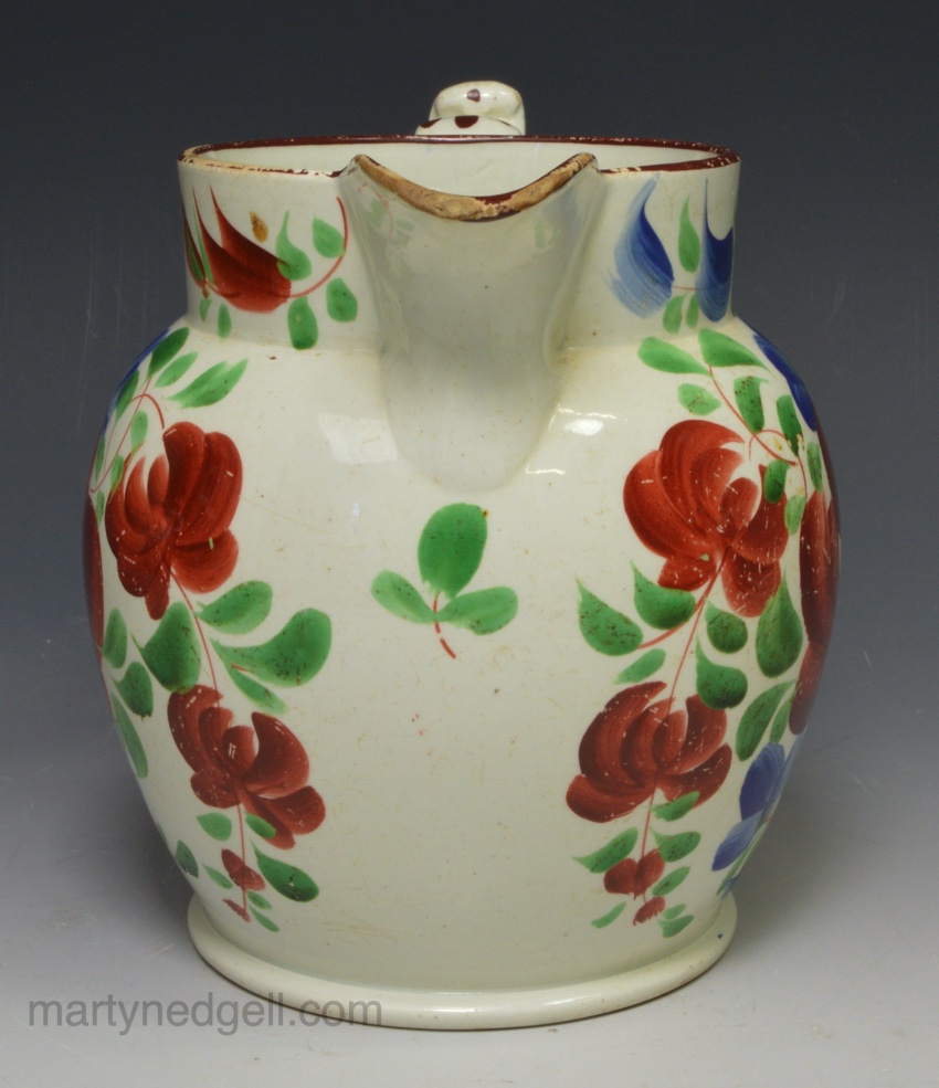 Pearlware pottery jug painted florals and colours over the glaze, circa 1820