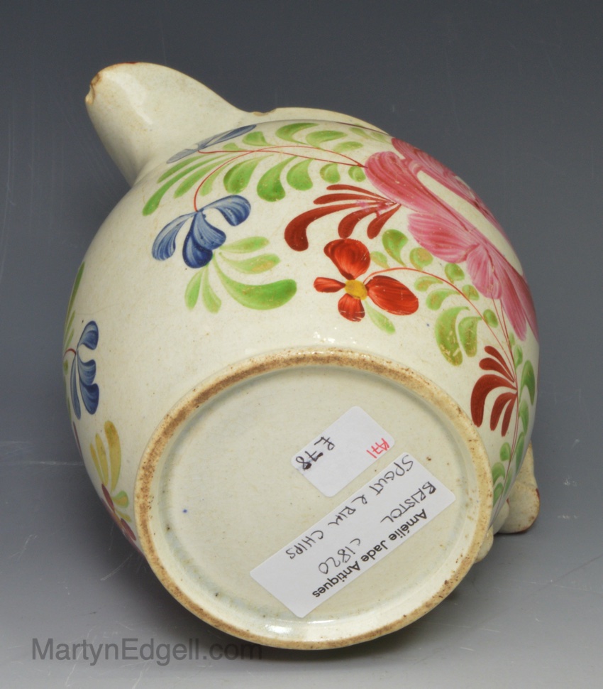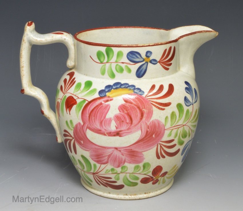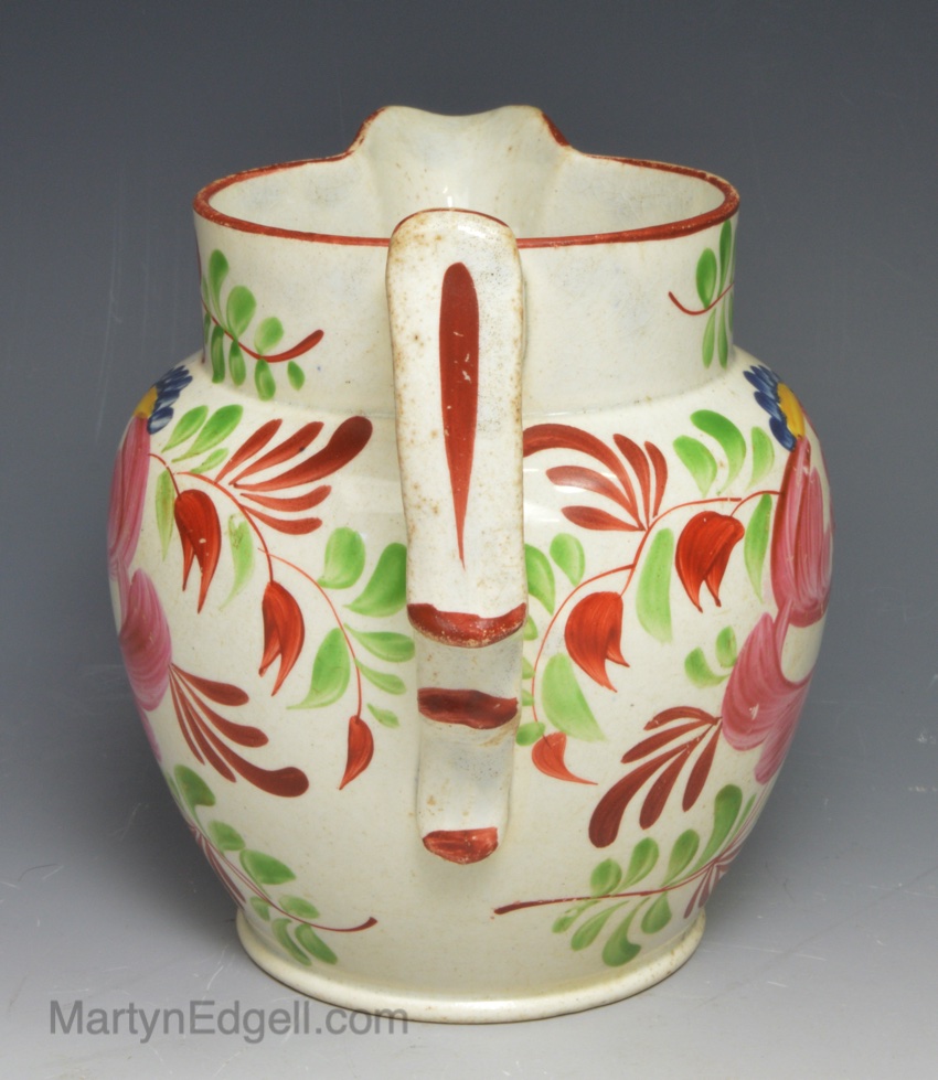 / Pearlware pottery jug painted florals and colours over the glaze, circa 1820