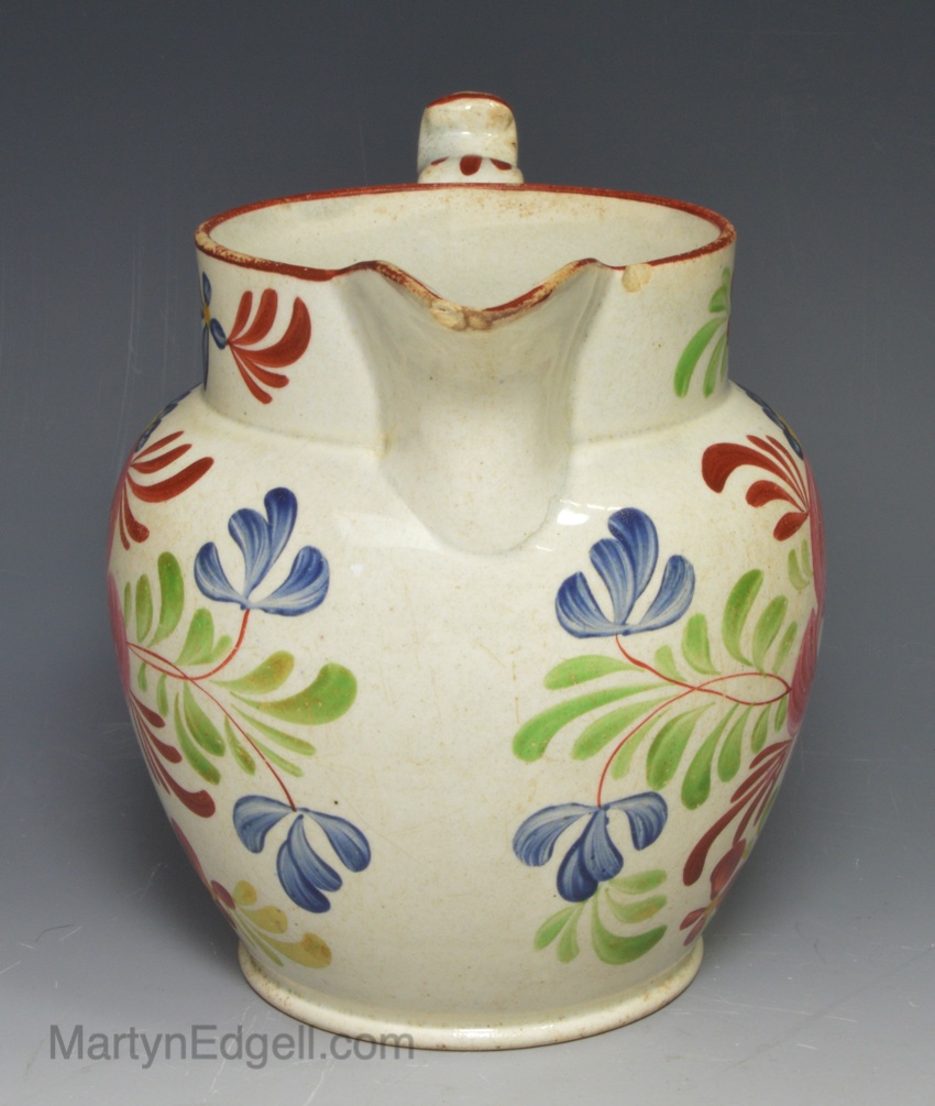 Pearlware pottery jug painted florals and colours over the glaze, circa 1820