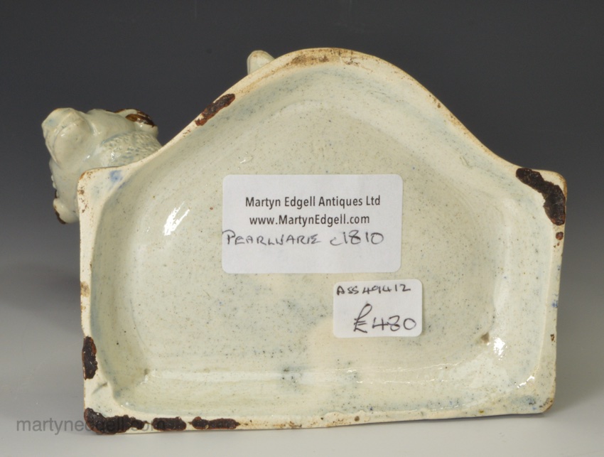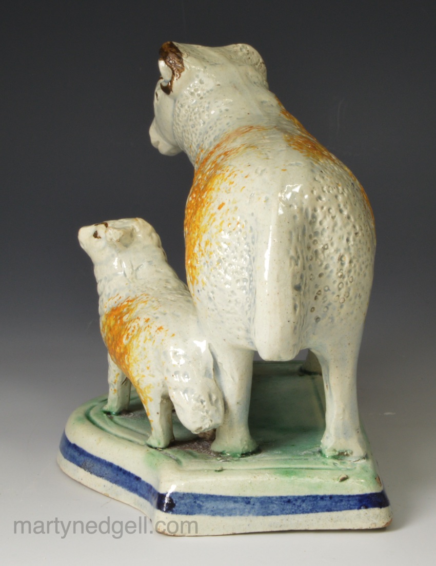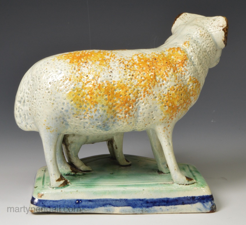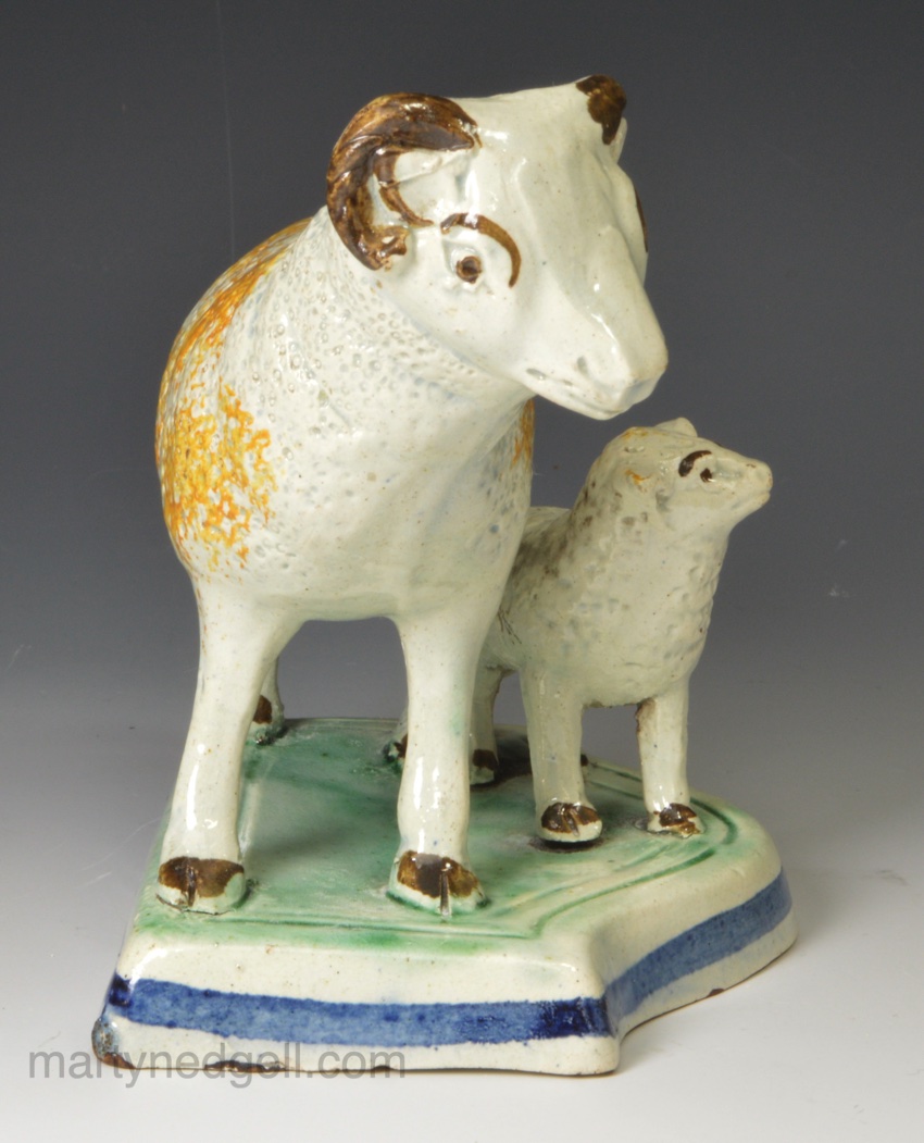 / Pearlware pottery model of a sheep and it’s lamb decorated under the glaze, circa 1810