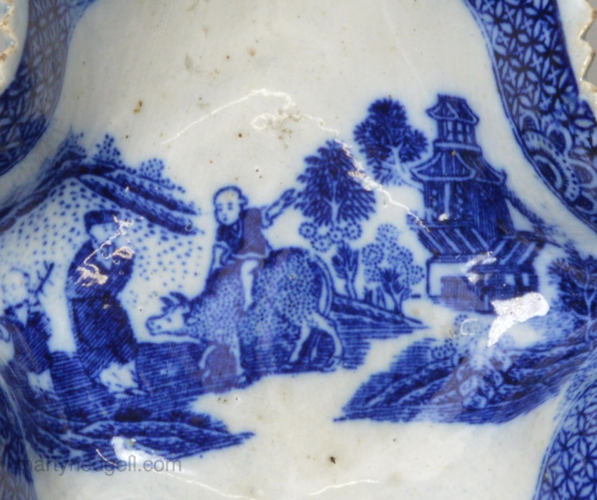 / Pearlware pottery pickle dish printed with boy on buffalo print, circa 1790