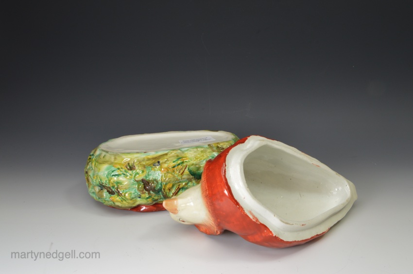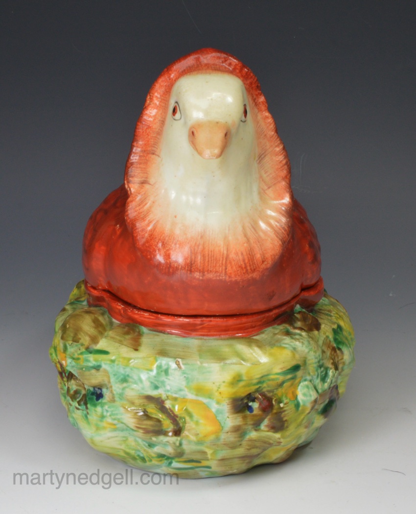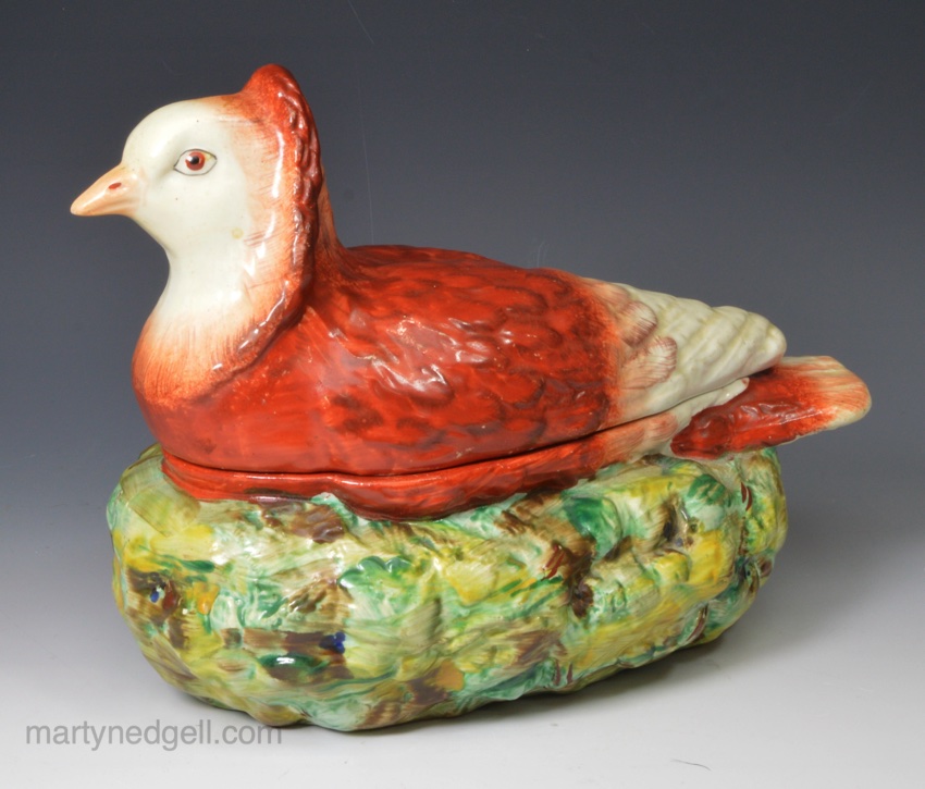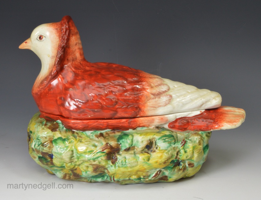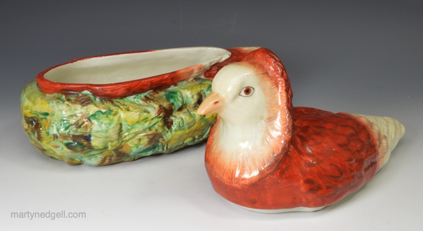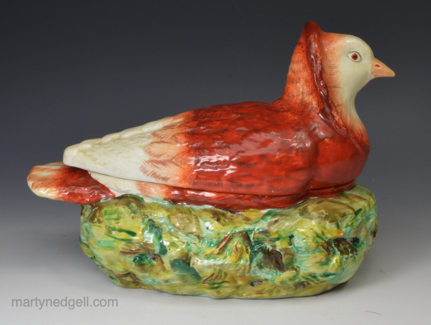 / Pearlware pottery pigeon tureen decorated with overglaze enamels, circa 1800