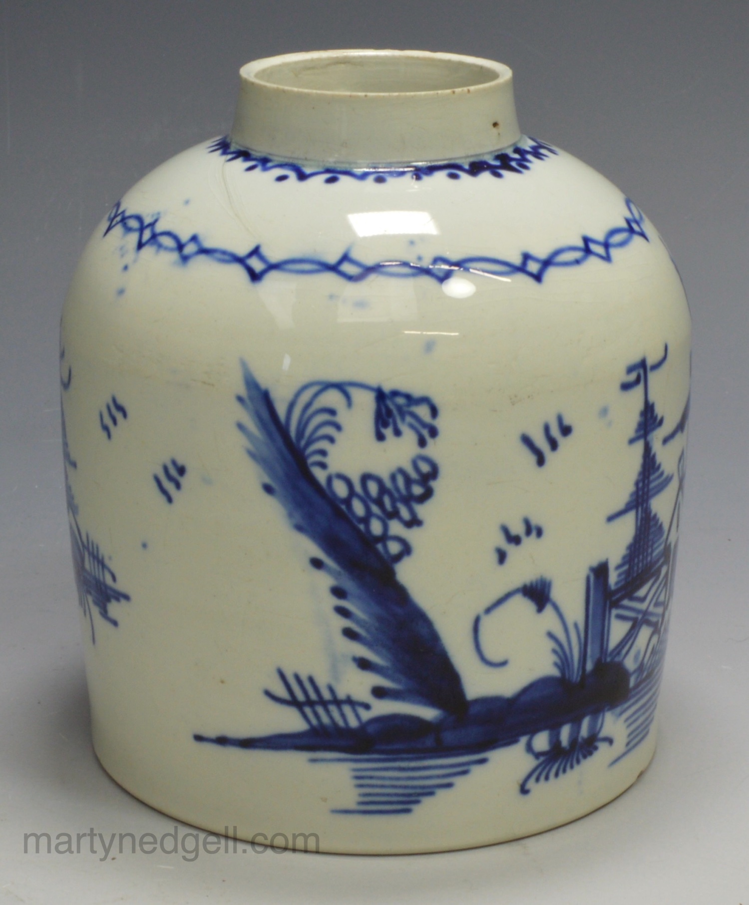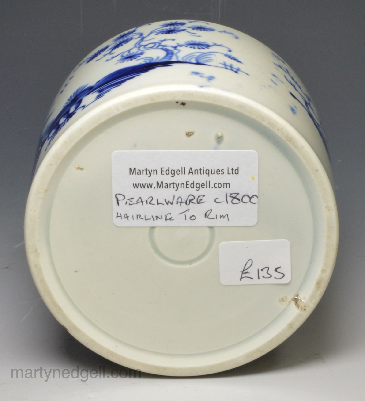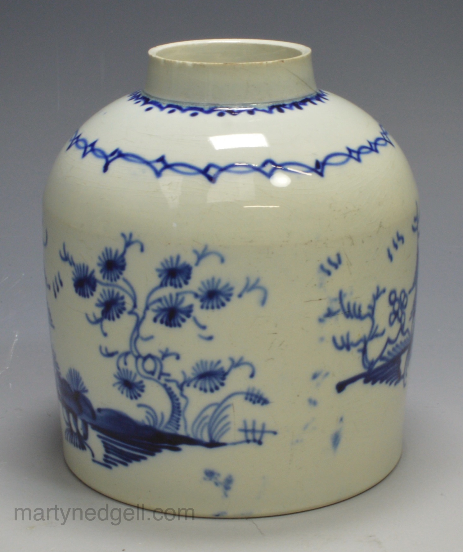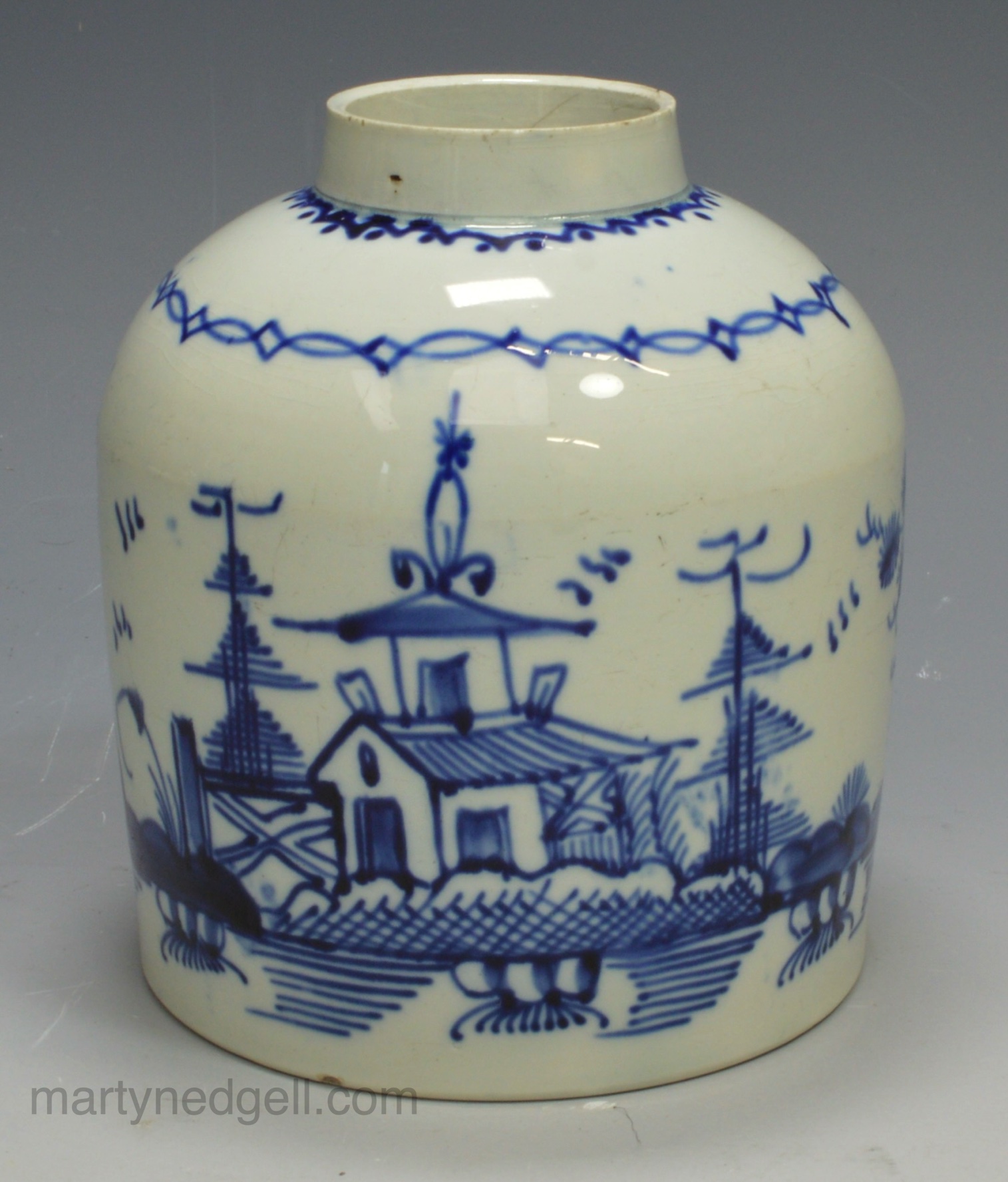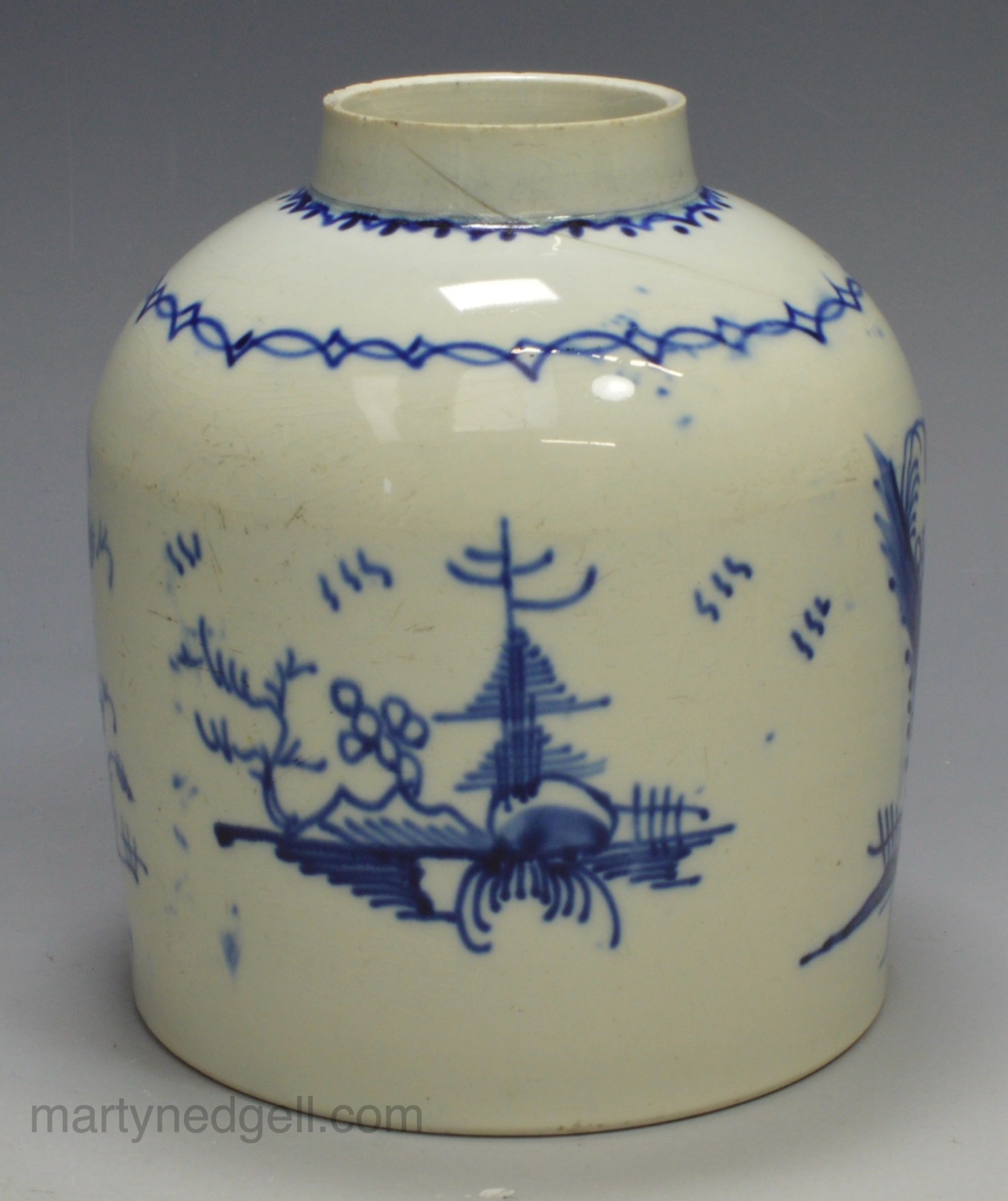 Pearlware pottery tea canister decorated in blue, circa 1800