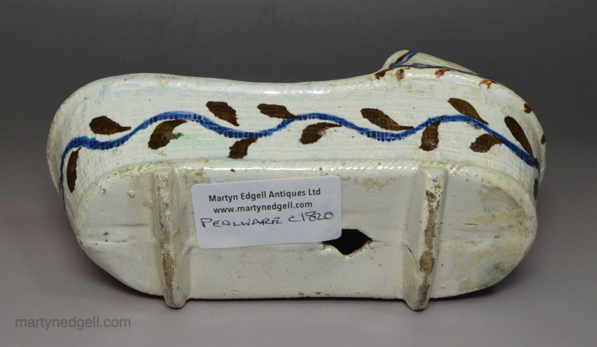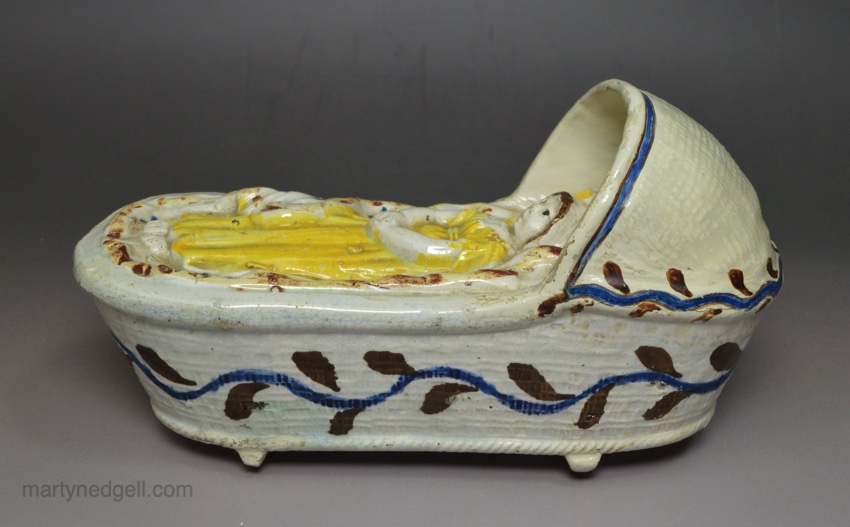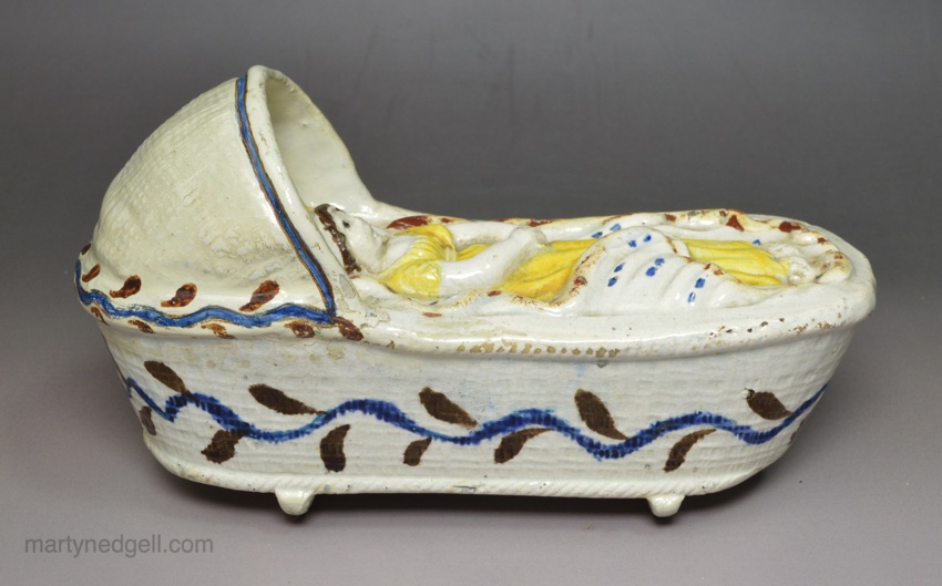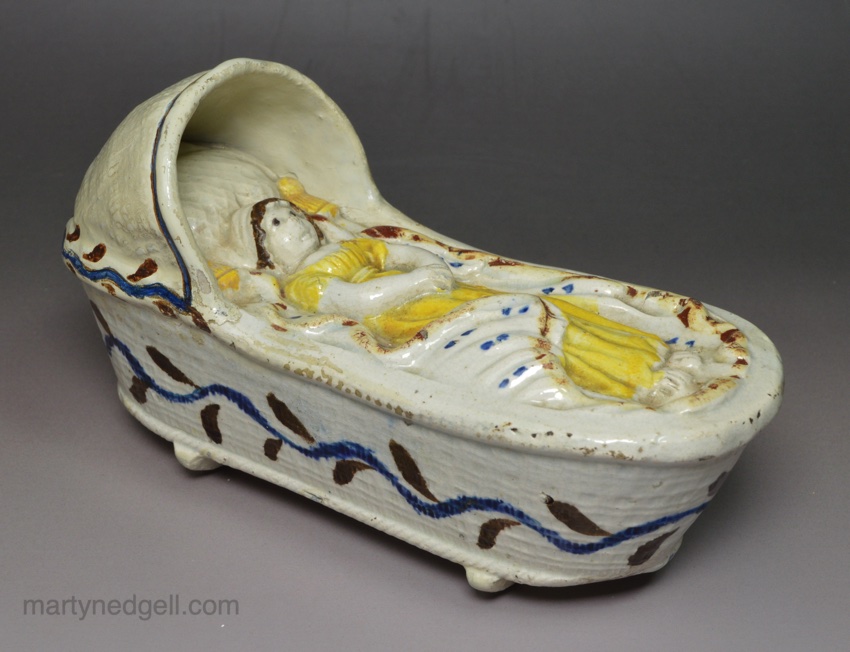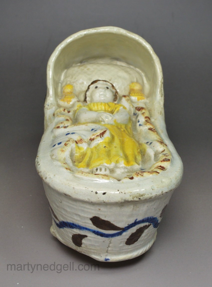/ Pearlware pottery toy cradle and baby, circa 1820