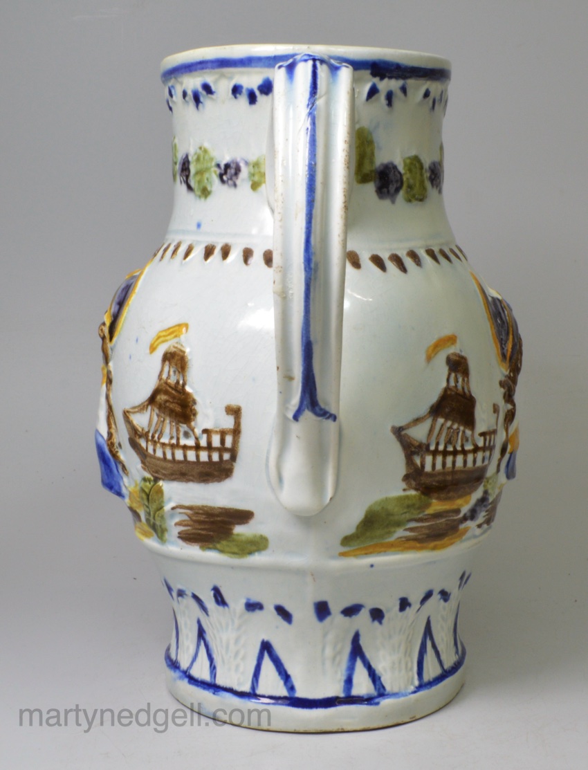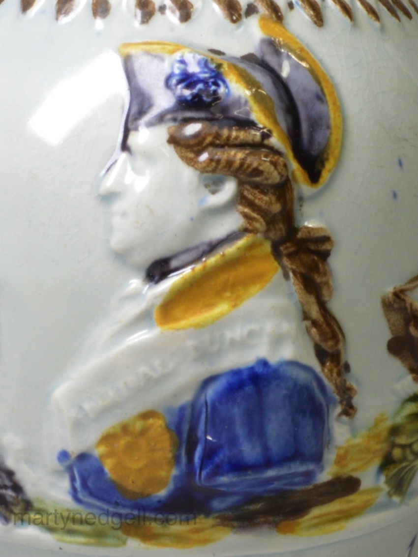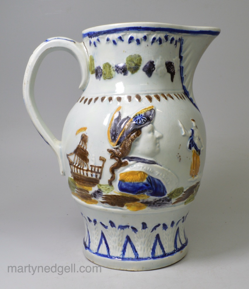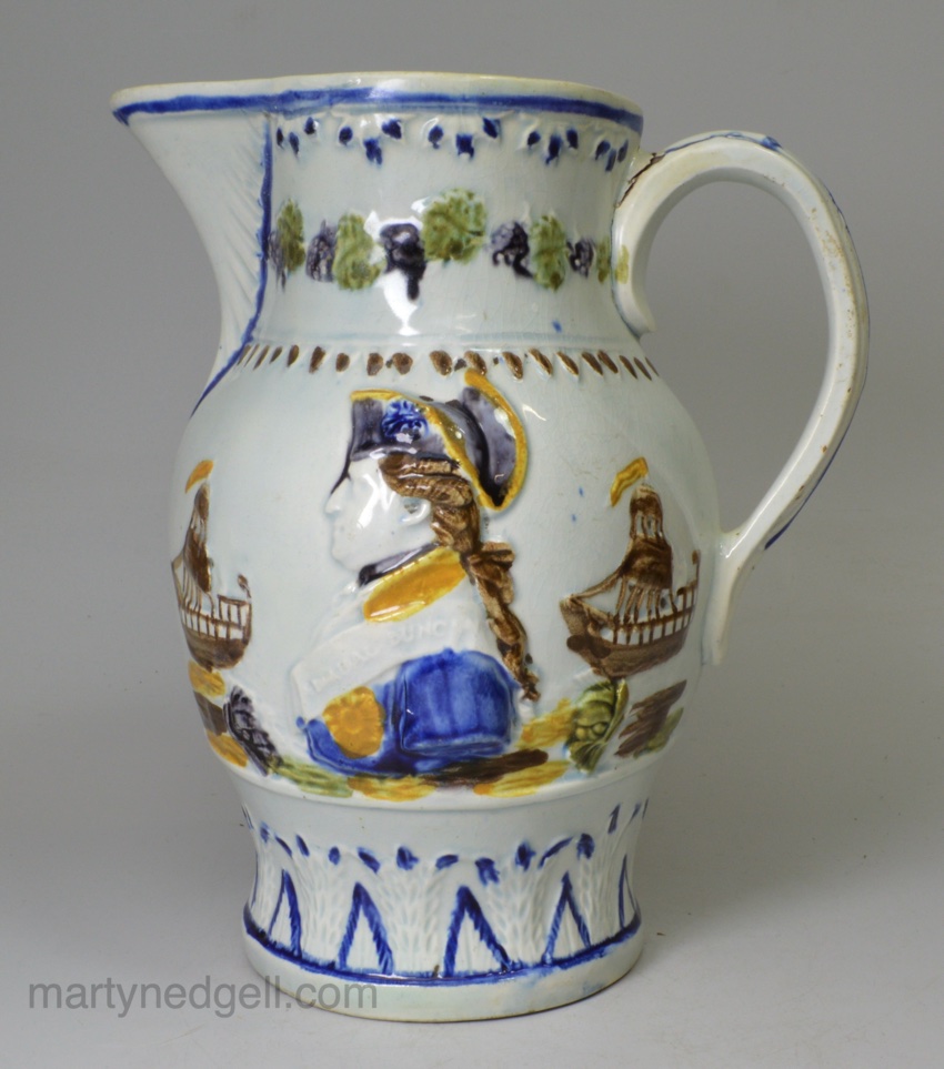 Prattware pottery commemorative jug moulded with Admiral Duncan and Captain Trolop (sic), circa 1800