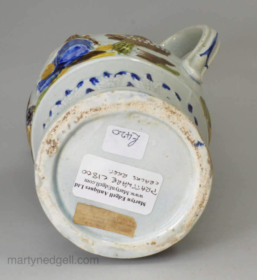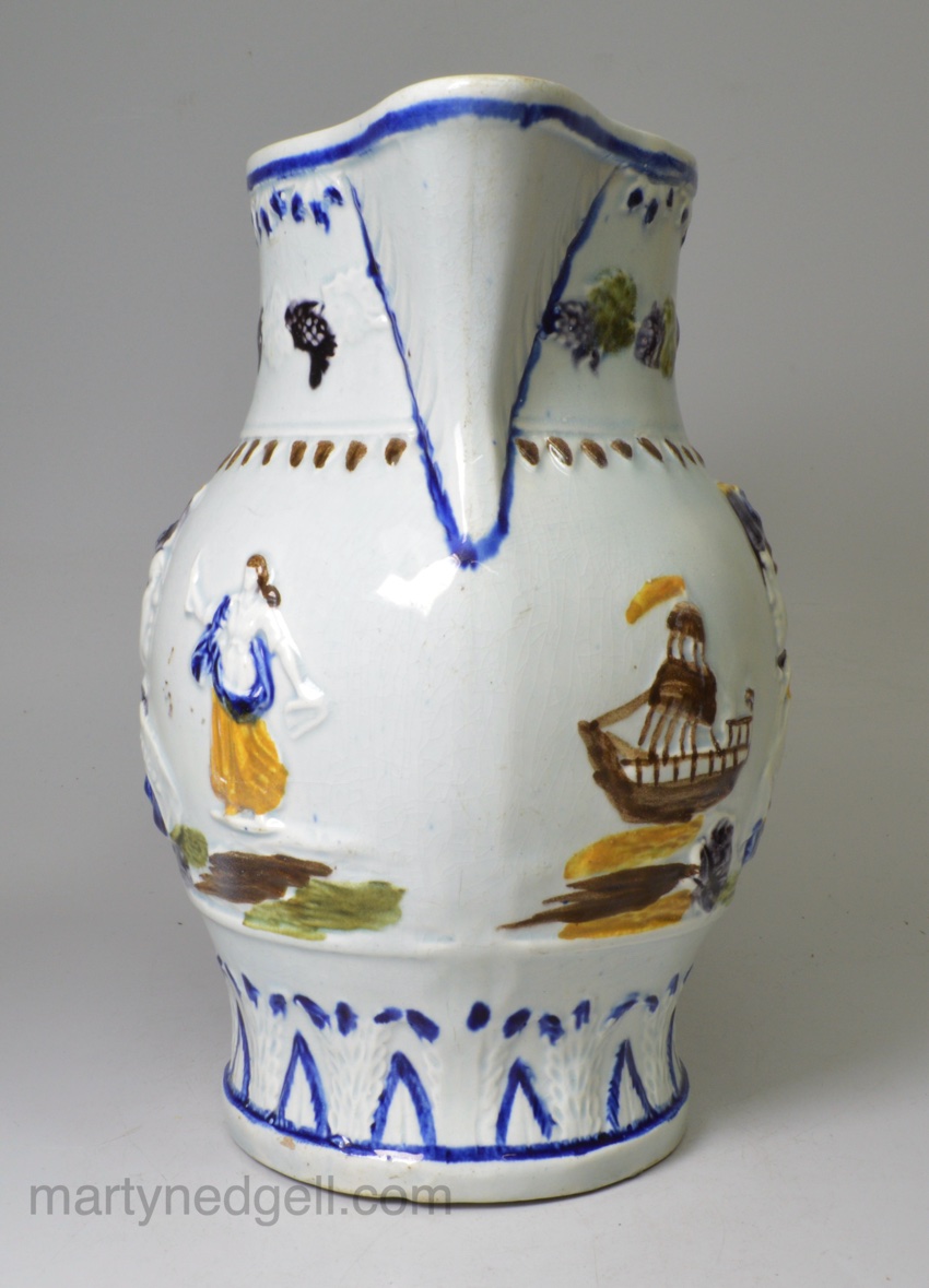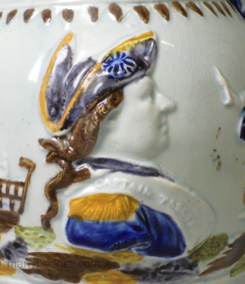 Prattware pottery commemorative jug moulded with Admiral Duncan and Captain Trolop (sic), circa 1800