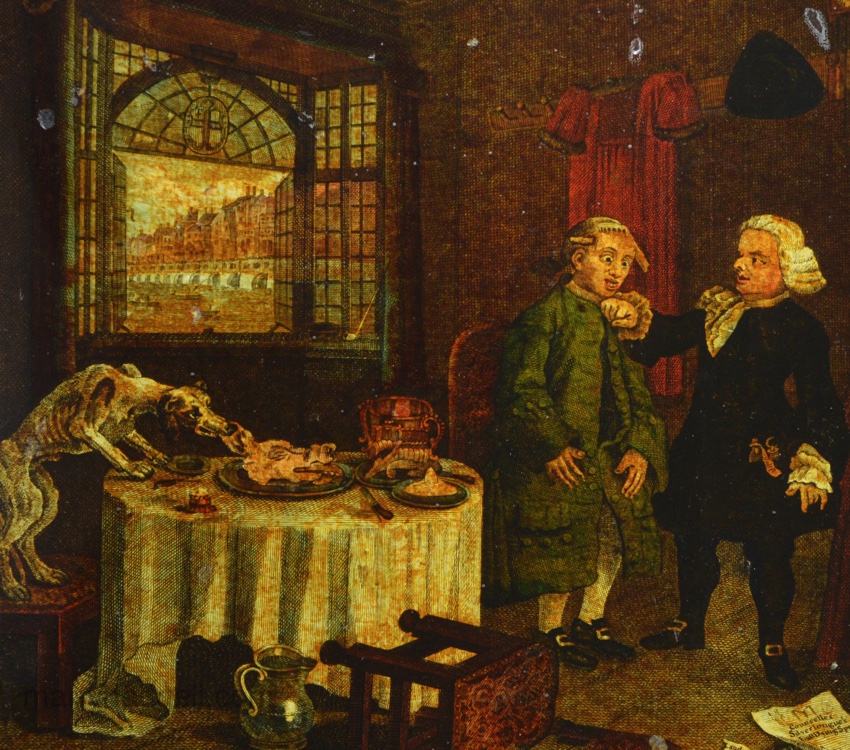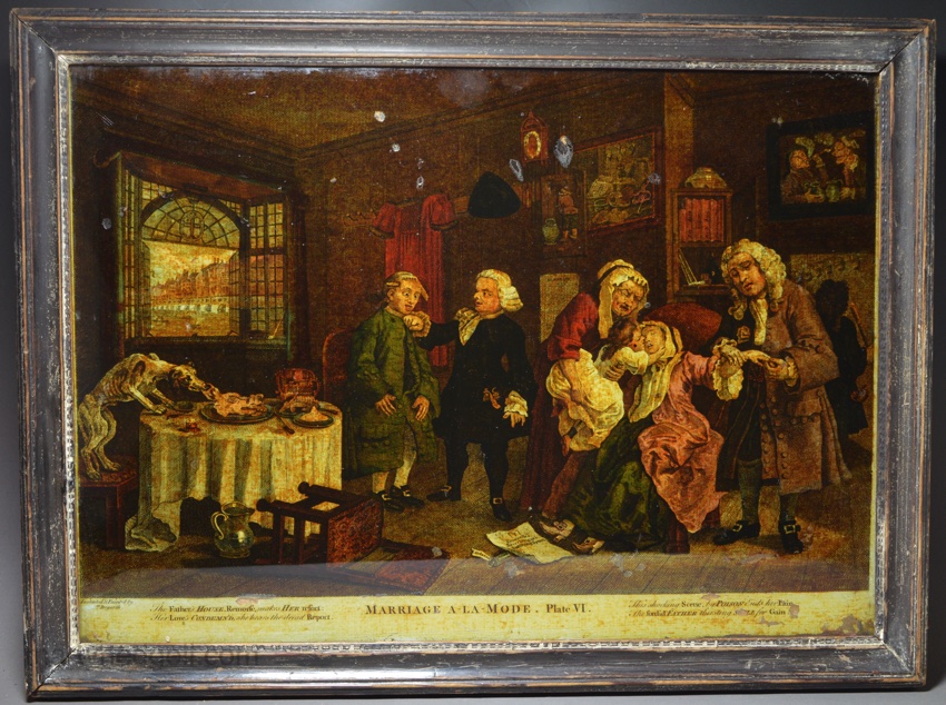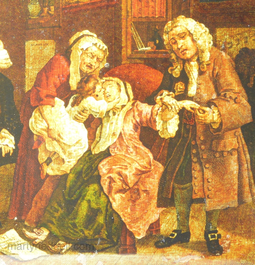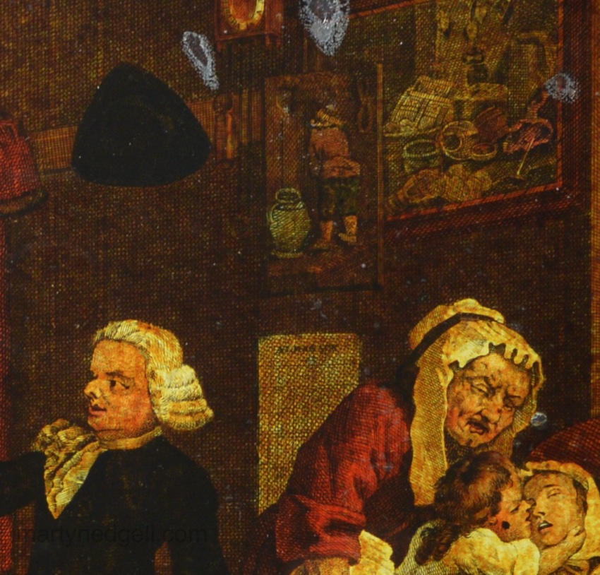 This sixth plate, ‘The Lady’s Death’, show the countess expiring in the modest home of her father, having drunk poison (a bottle of laudanum lies on the floor). The cause of this is the broadside next to the bottle which reports the hanging of her lover Silvertongue for the murder of her husband (depicted in the previous plate). She is embraced by her child, who displays symptoms of advanced congenital syphilis and is likely to follow its parents to an early grave. There is an interesting view of old London Bridge out of the window.