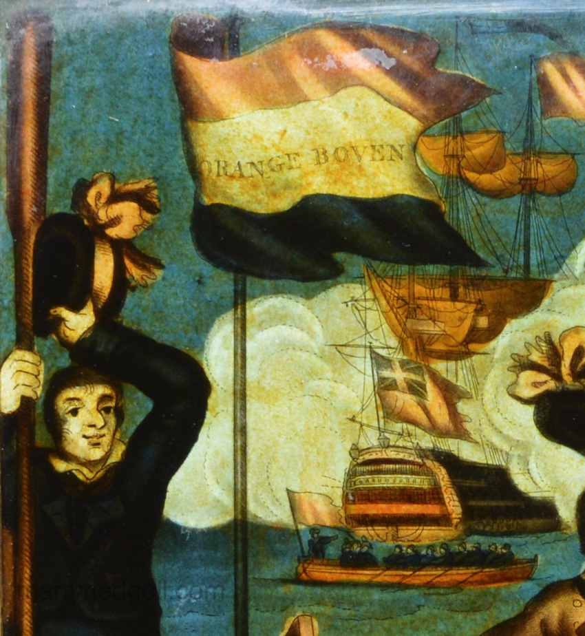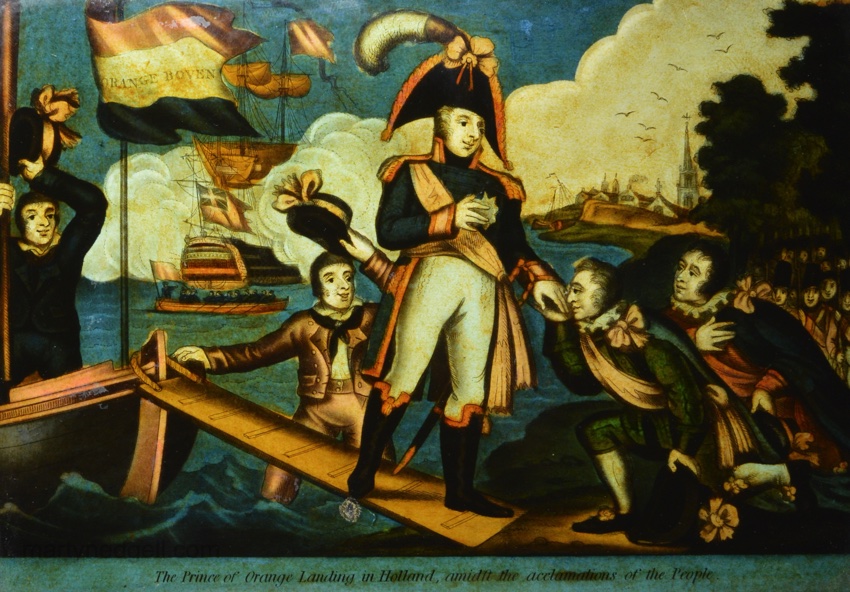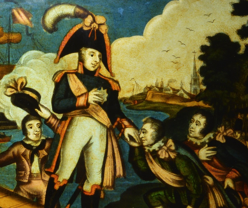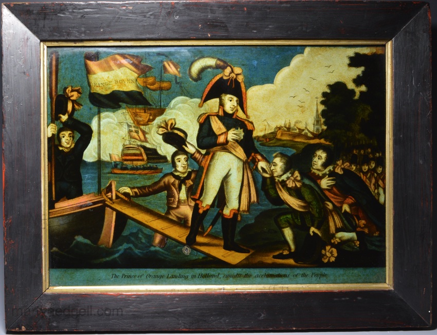 Reverse print on glass of William of Orange later William III returning to Holland, circa 1810