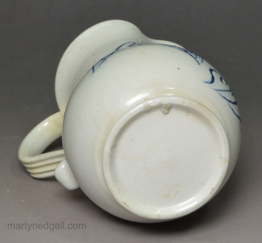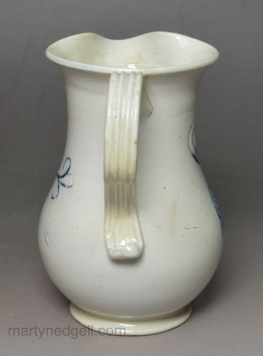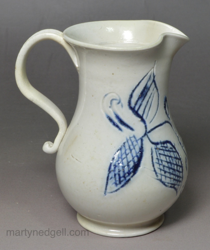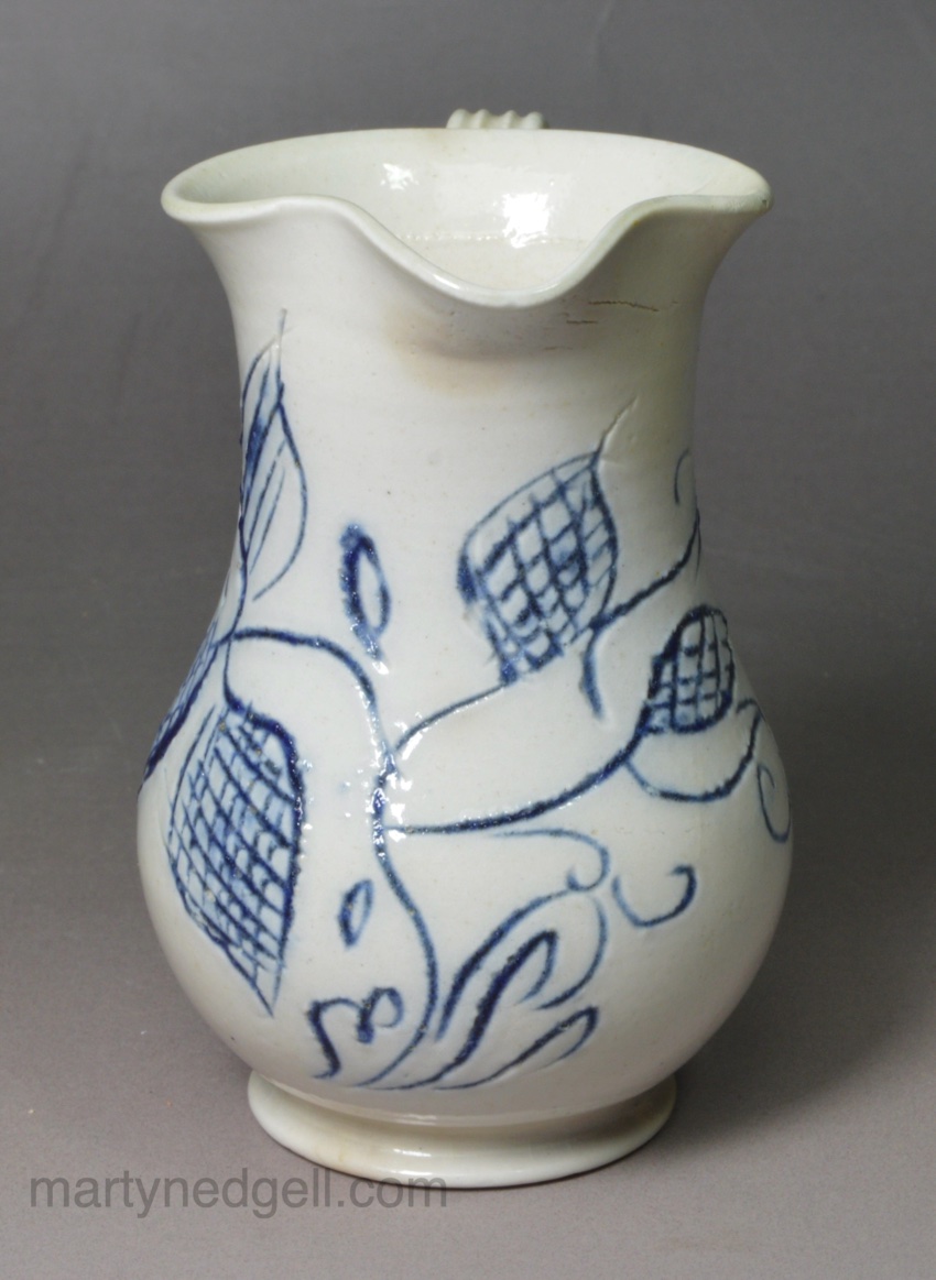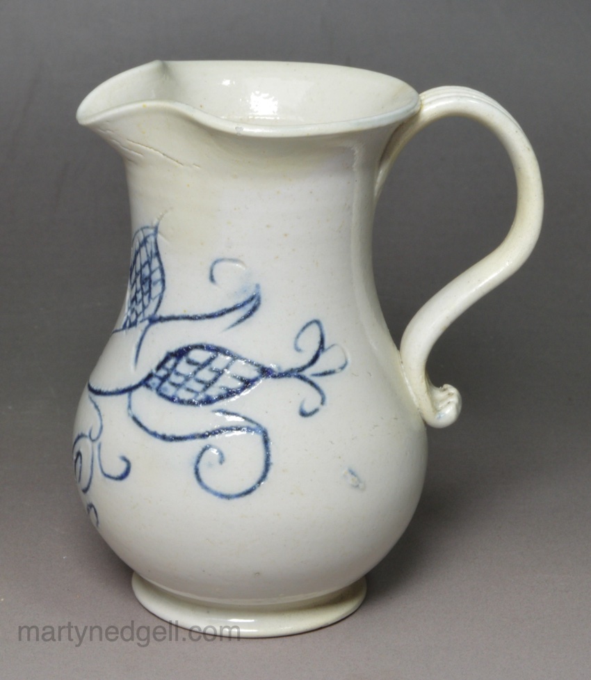 / Small Staffordshire white saltglaze stoneware jug with scratch blue decoration, circa 1760