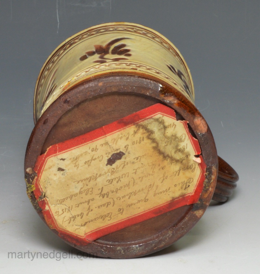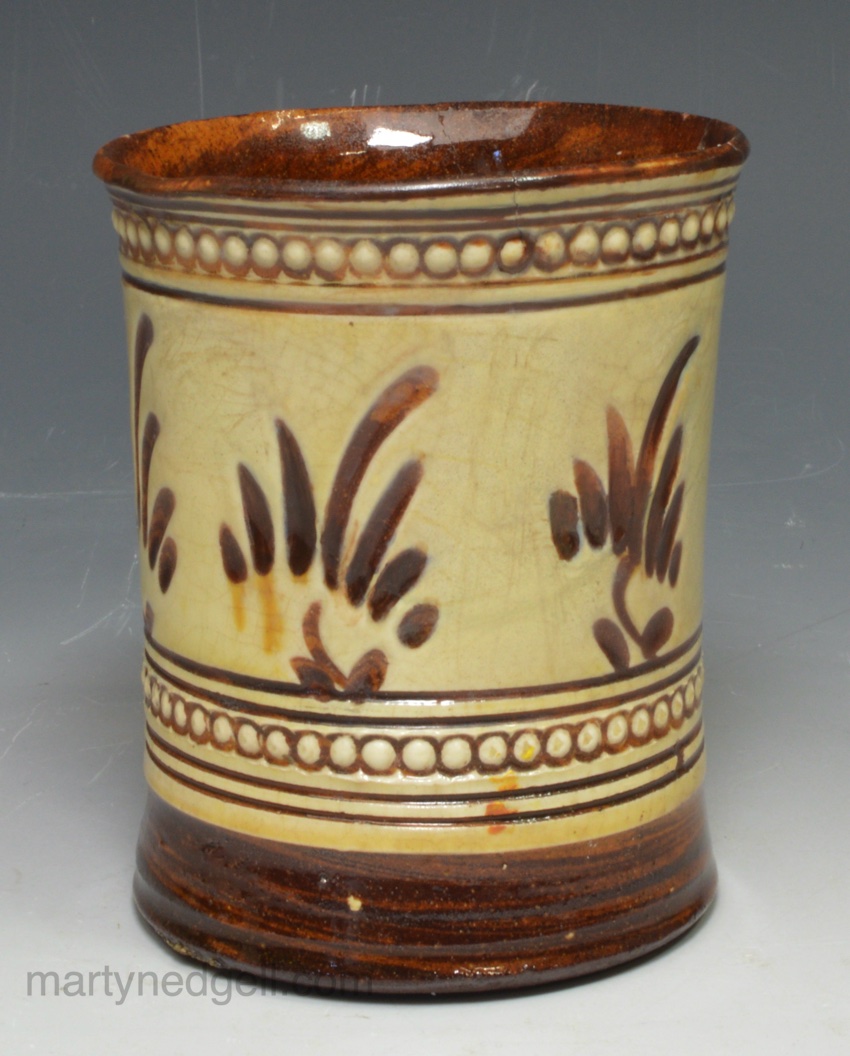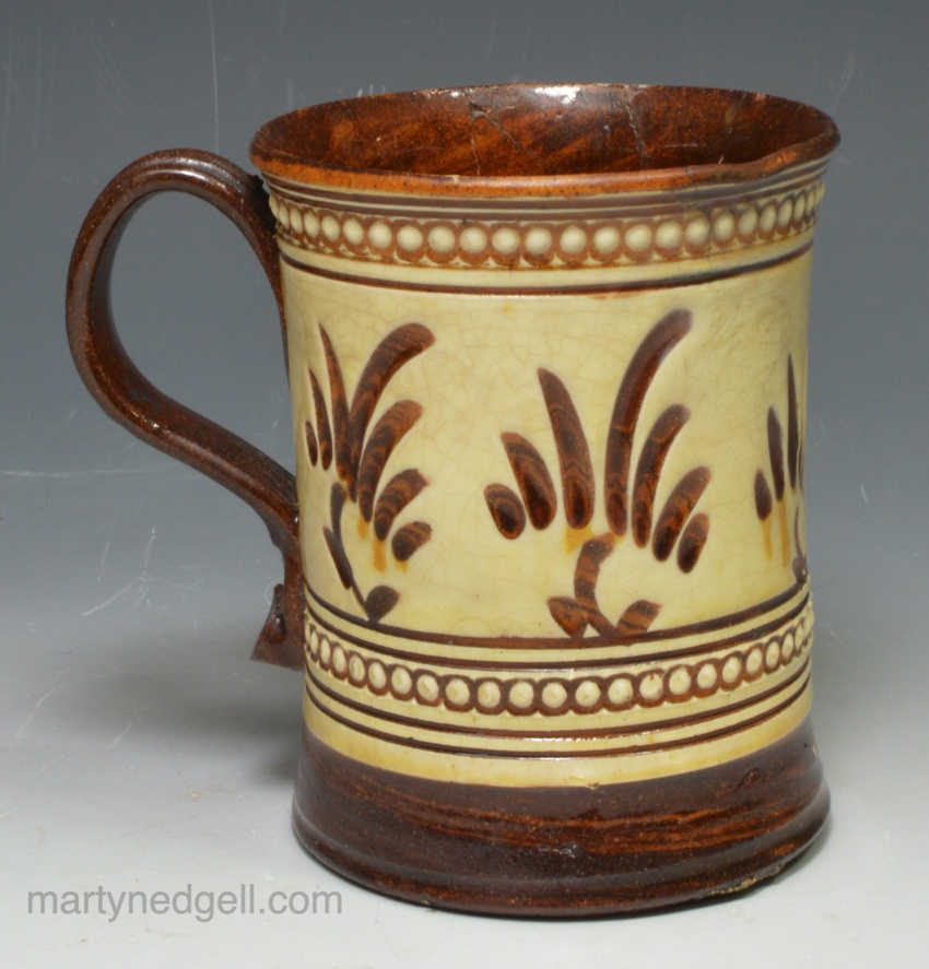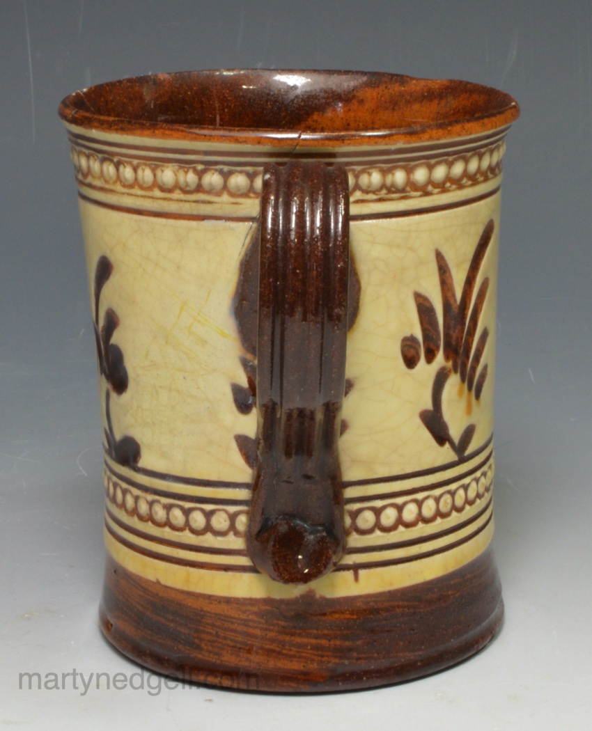 / Staffordshire brown agate mug decorated with cream slip that has been carved away, circa 1750