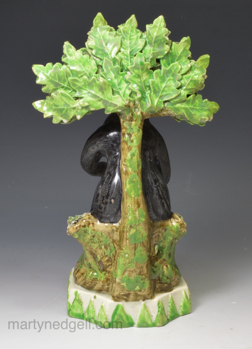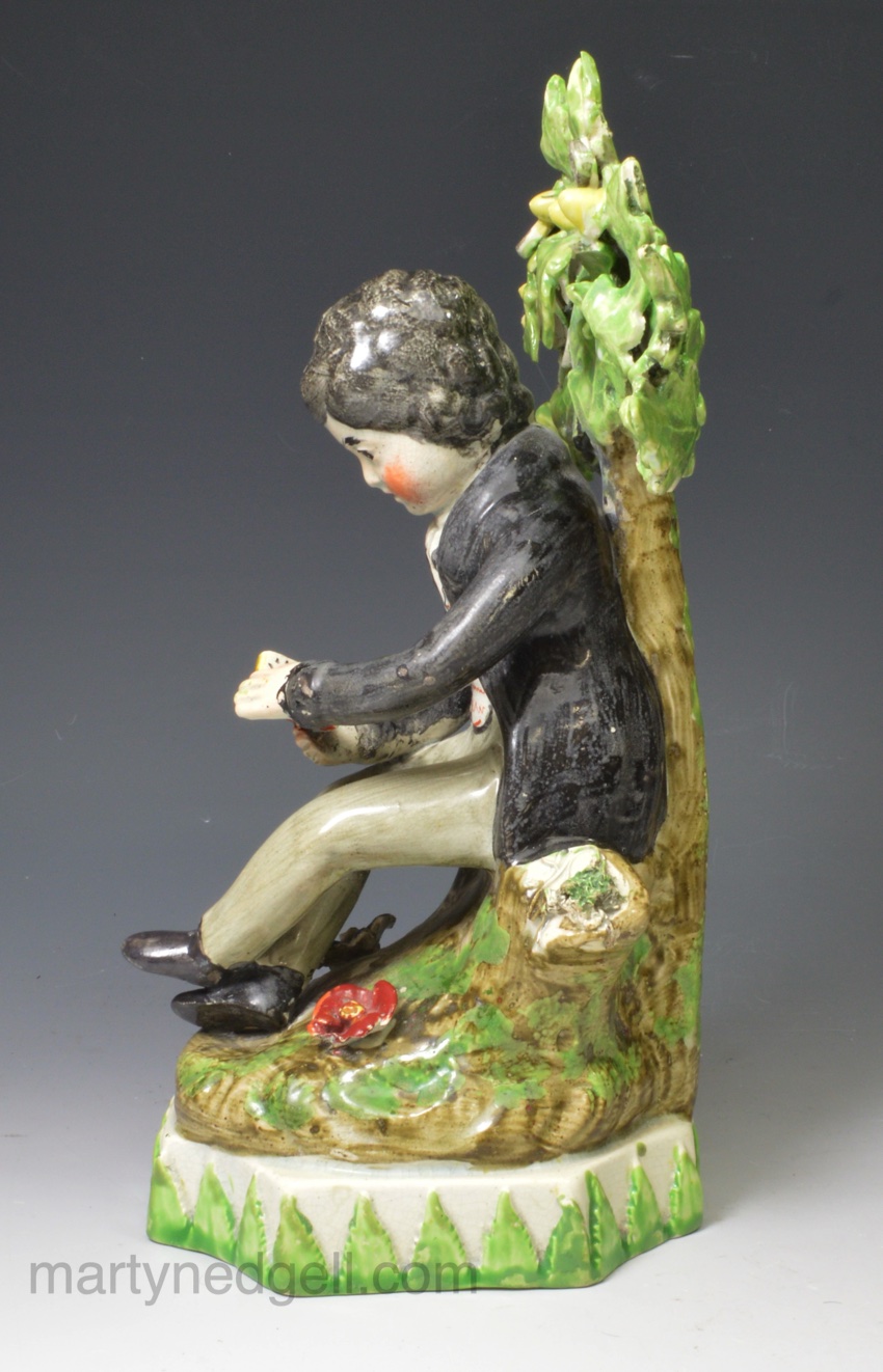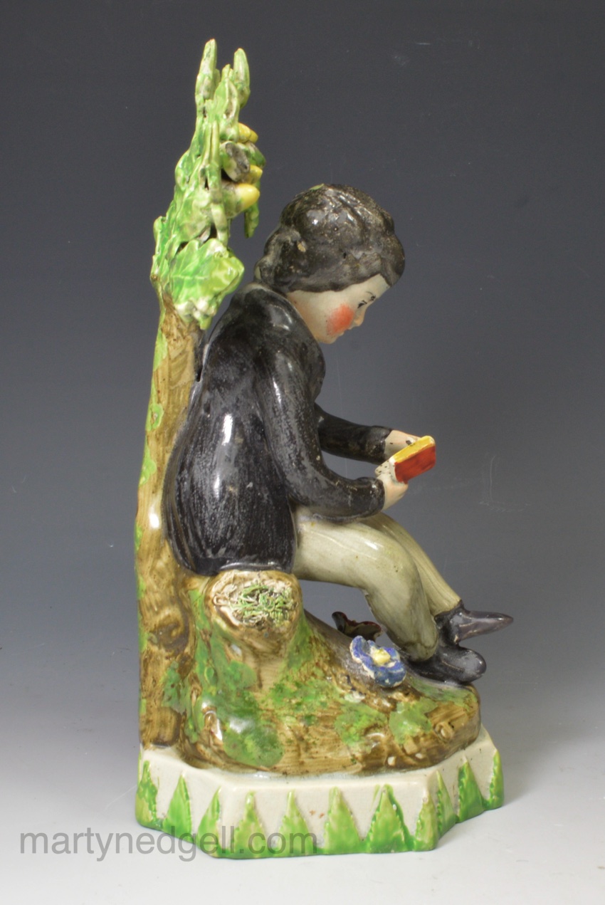 Staffordshire pearlware pottery bocage figure of a boy reading, circa 1820