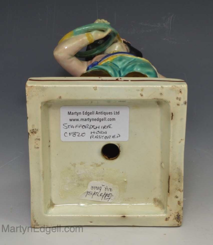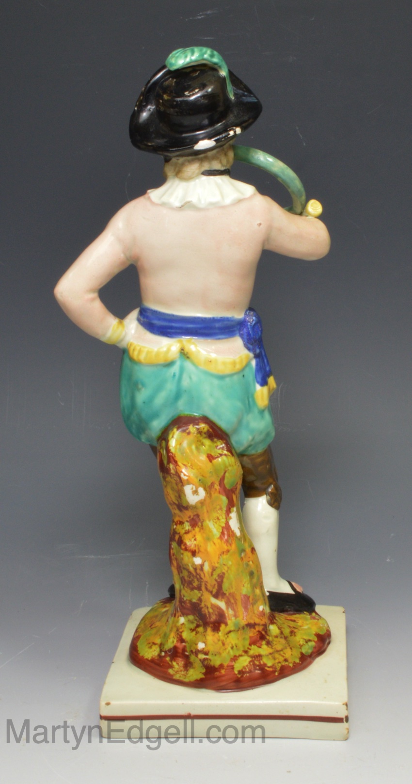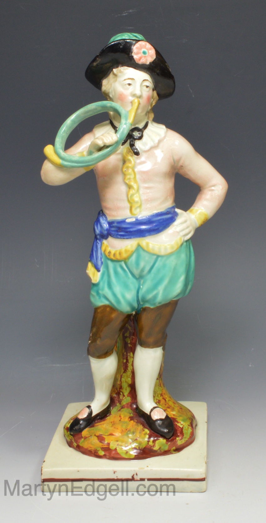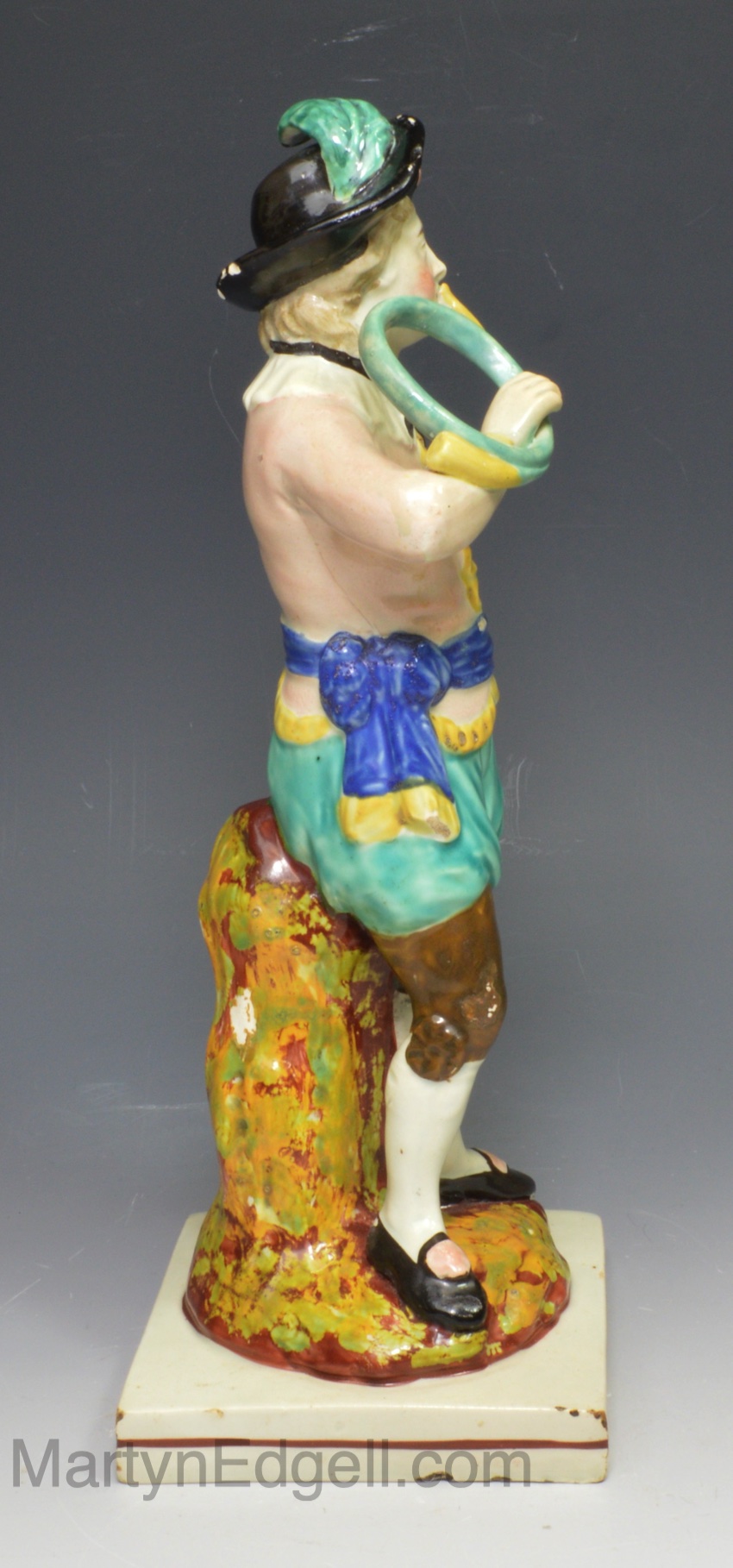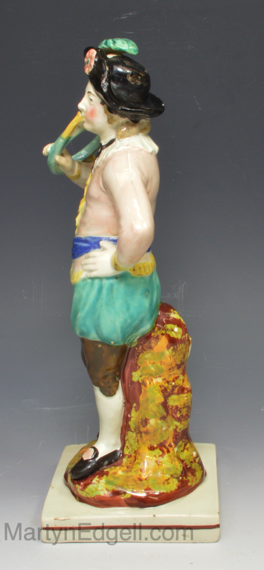Staffordshire pearlware pottery figure of a boy playing a horn, circa 1820