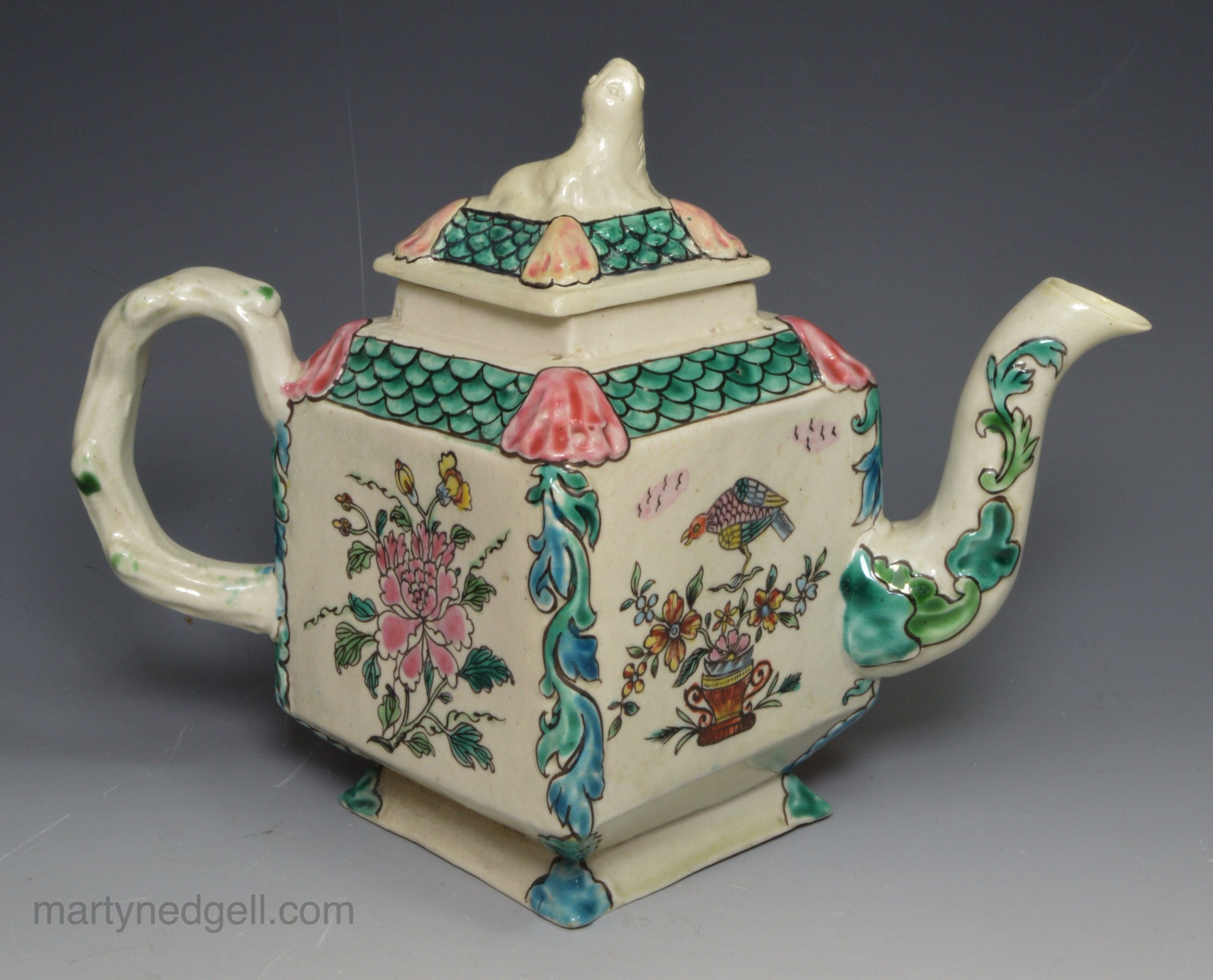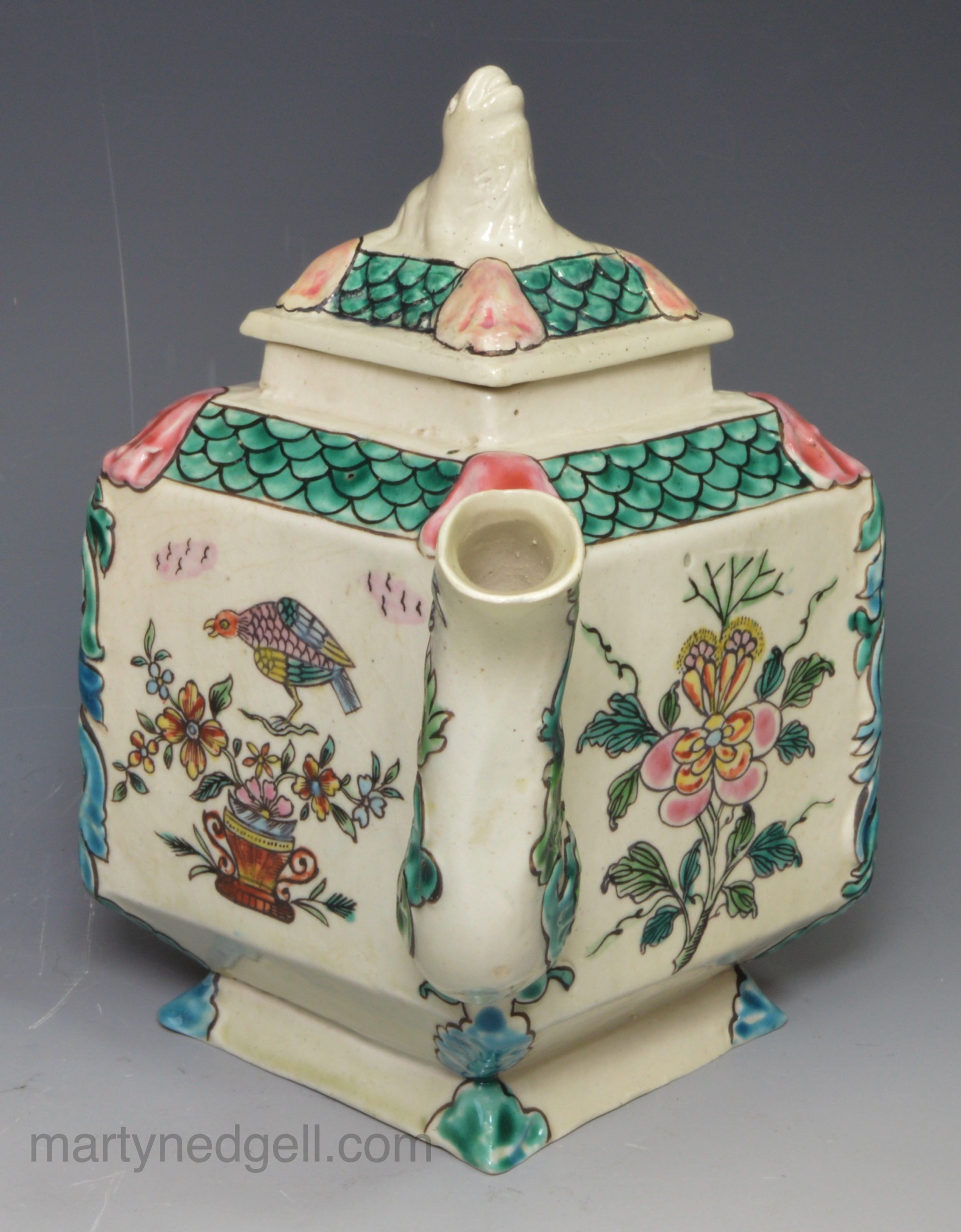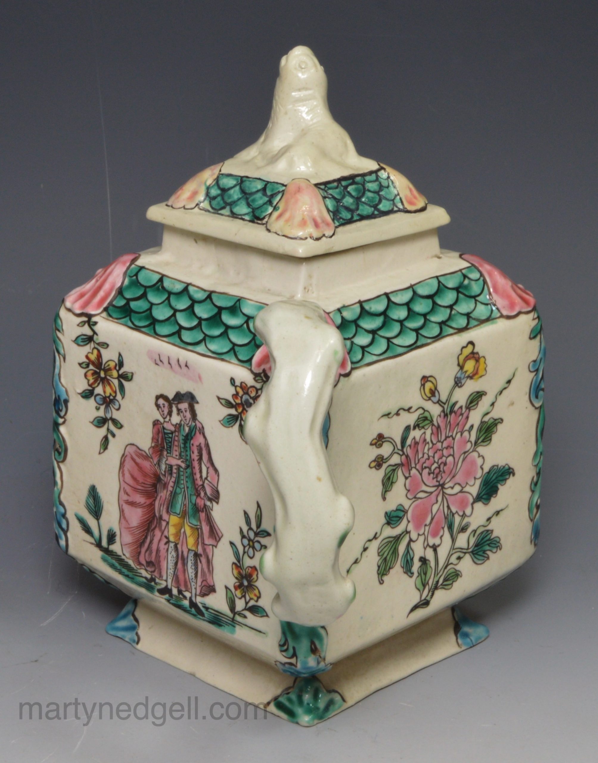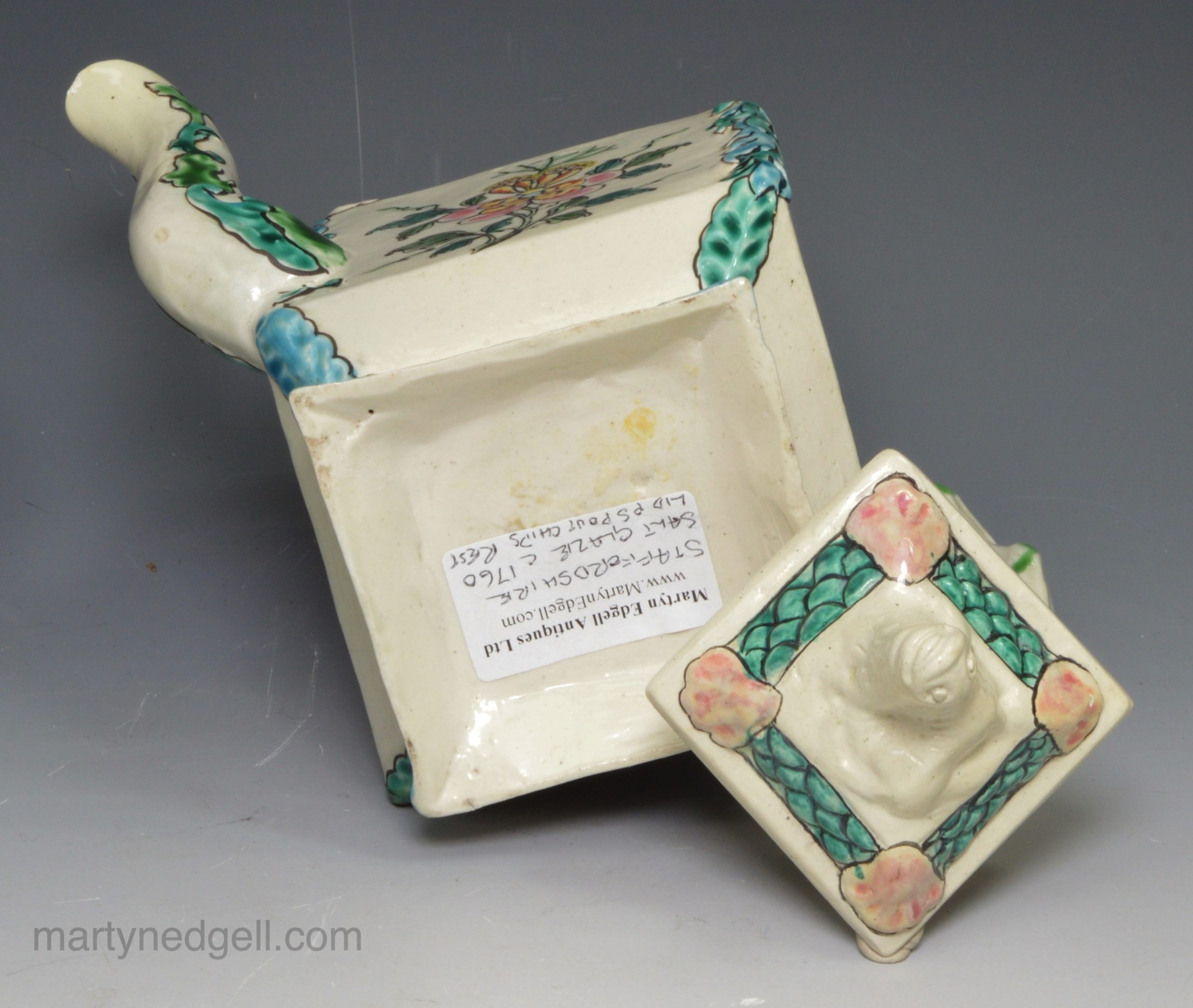 / Staffordshire saltglaze stoneware teapot decorated with overglaze enamels, circa 1760