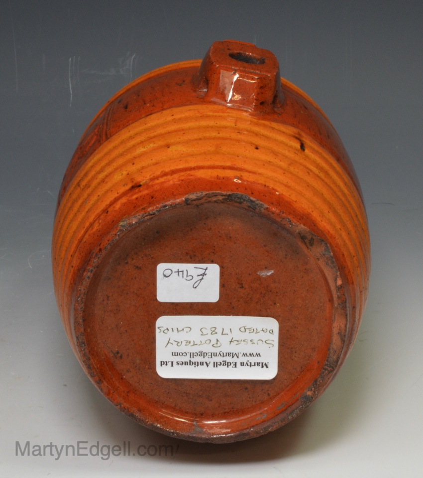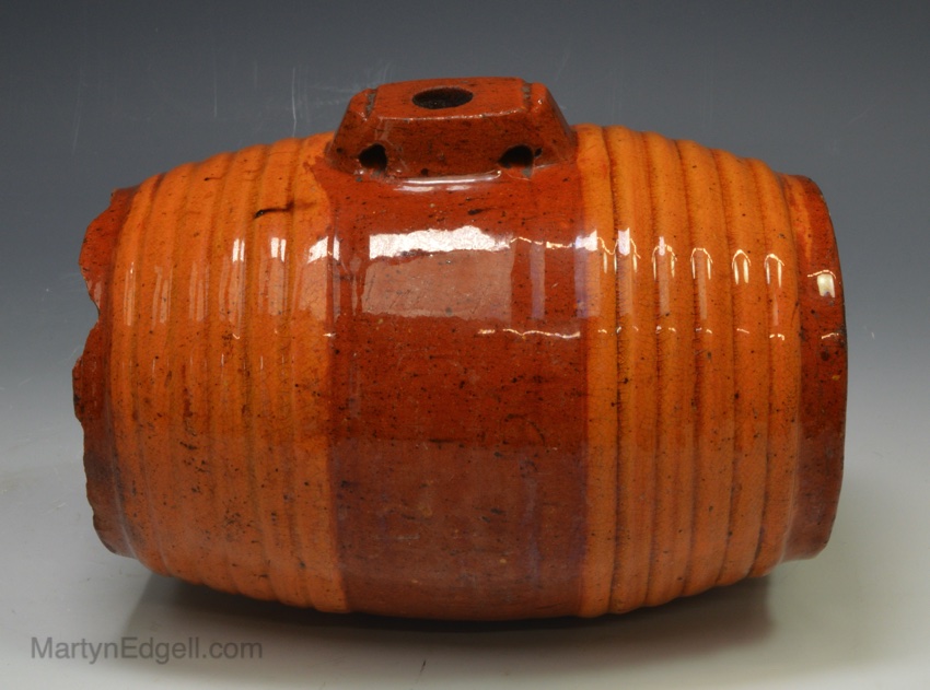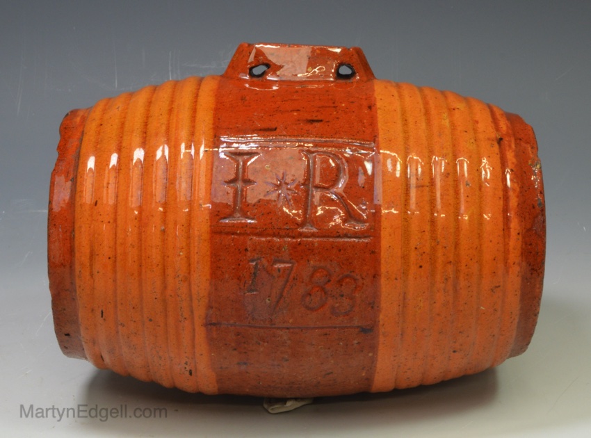 Sussex pottery red earthenware spirit barrel, dated 1783