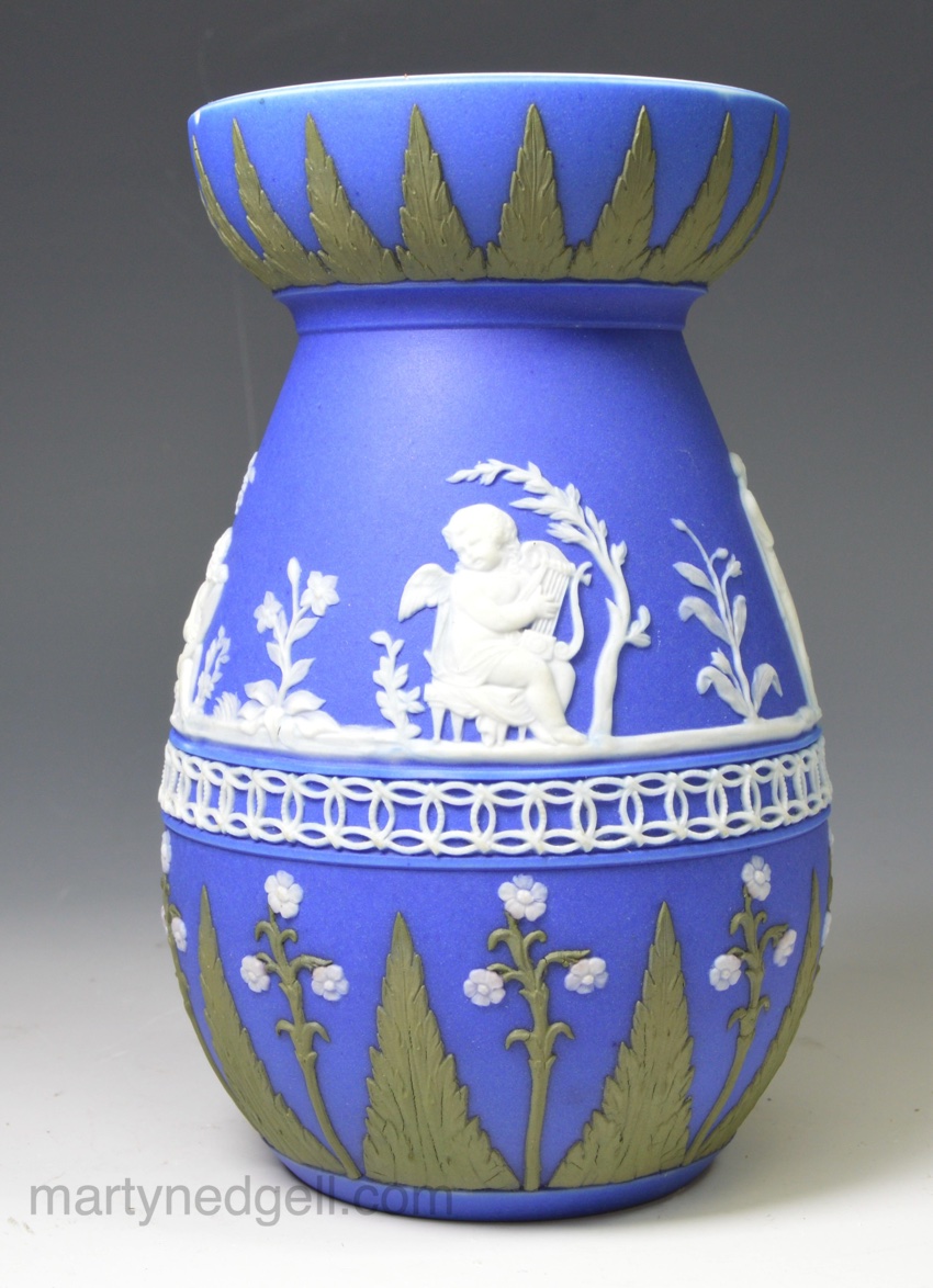 / Three colour jasper ware hyacinth vase, circa 1880, Adams Pottery Staffordshire