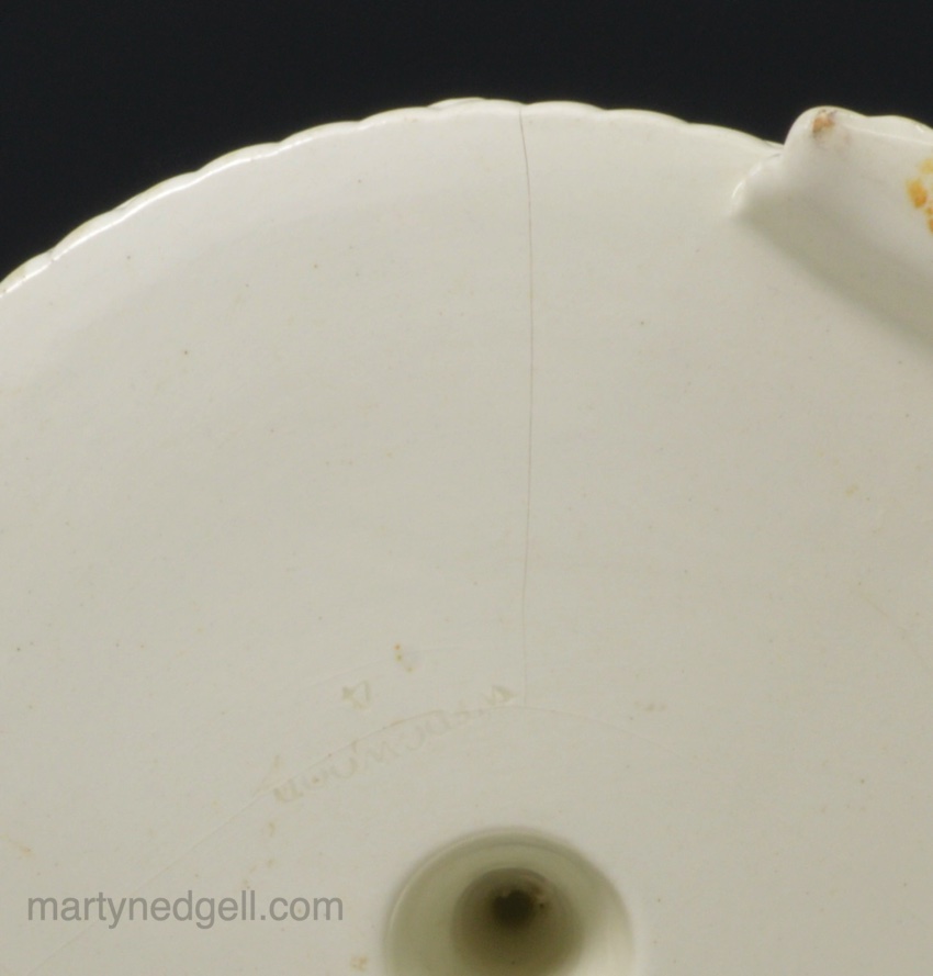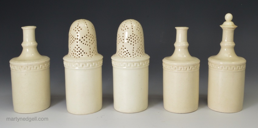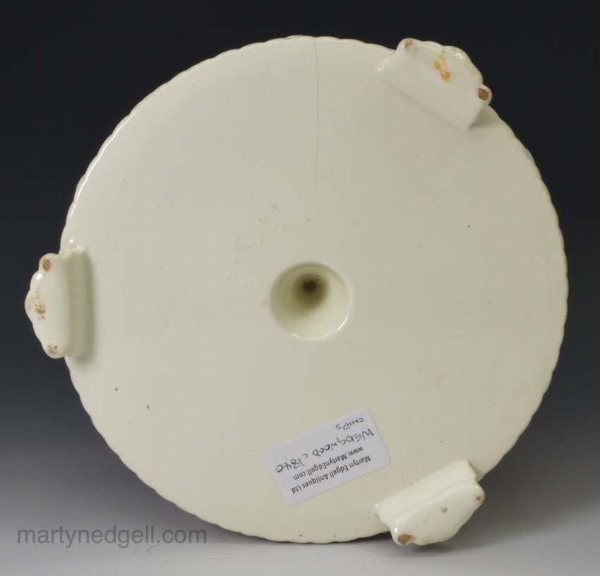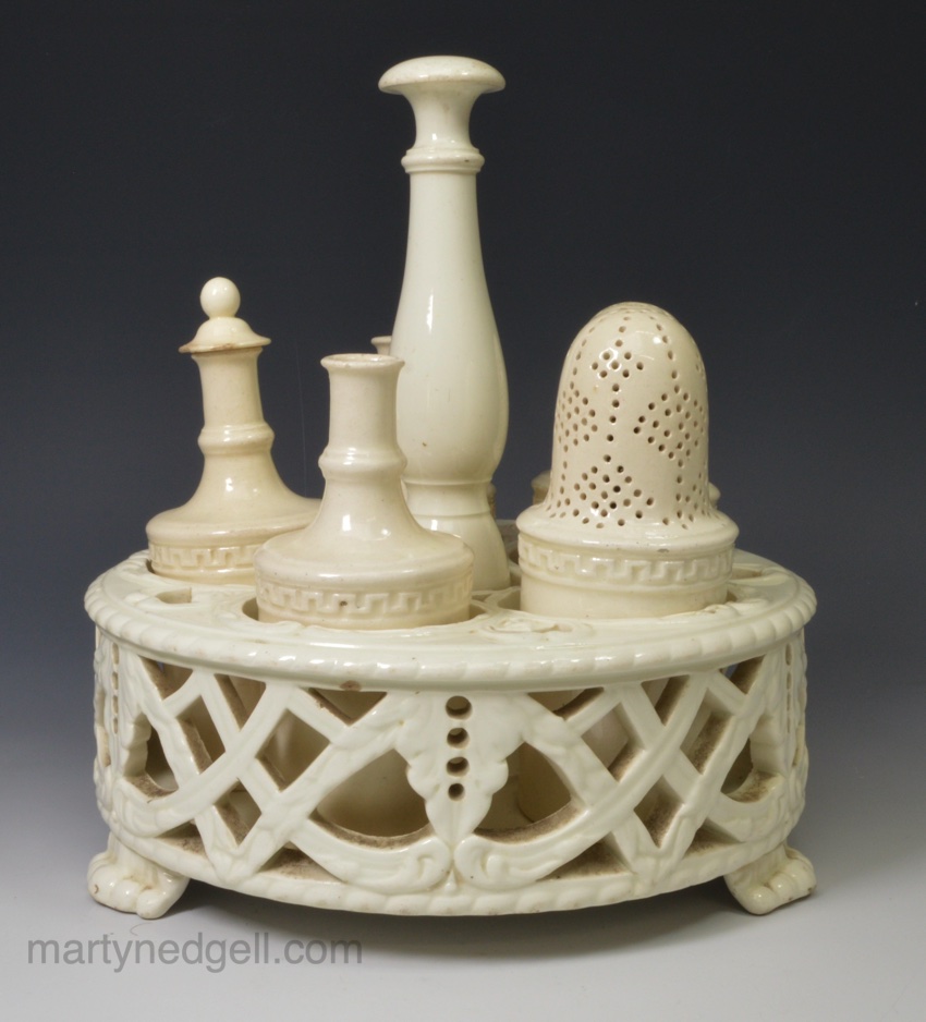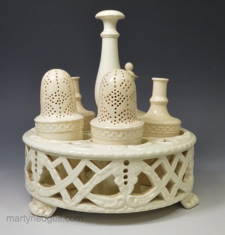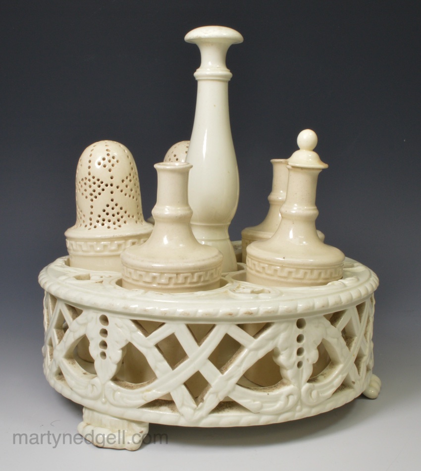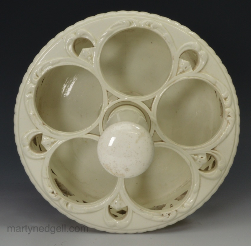 Condition: The stand, marked “WEDGWOOD” is about 1790, the condiment inserts probably mid 19th century. The stand has a hairline crack on the base and the stopper in one of the pots has chips