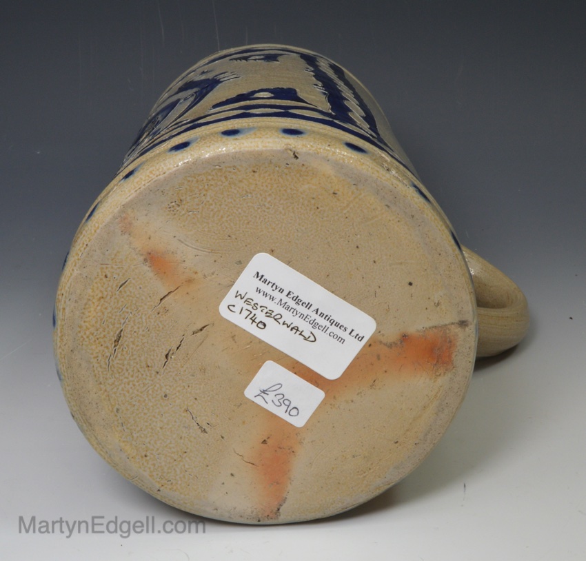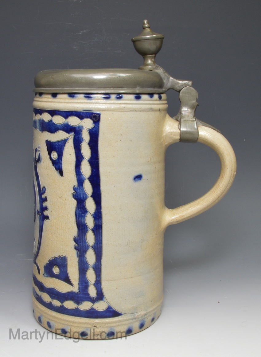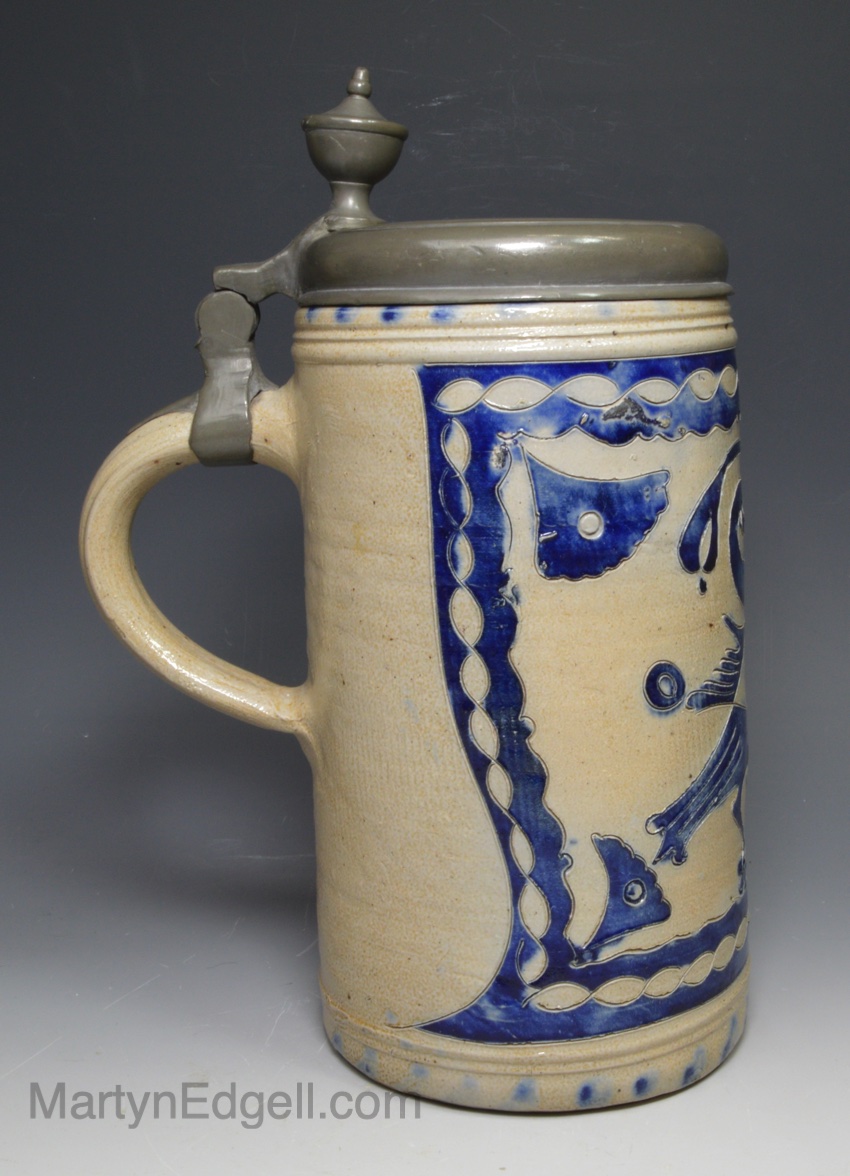 / Westerwald saltglaze stoneware tankard decorated with exotic bird, circa 1740